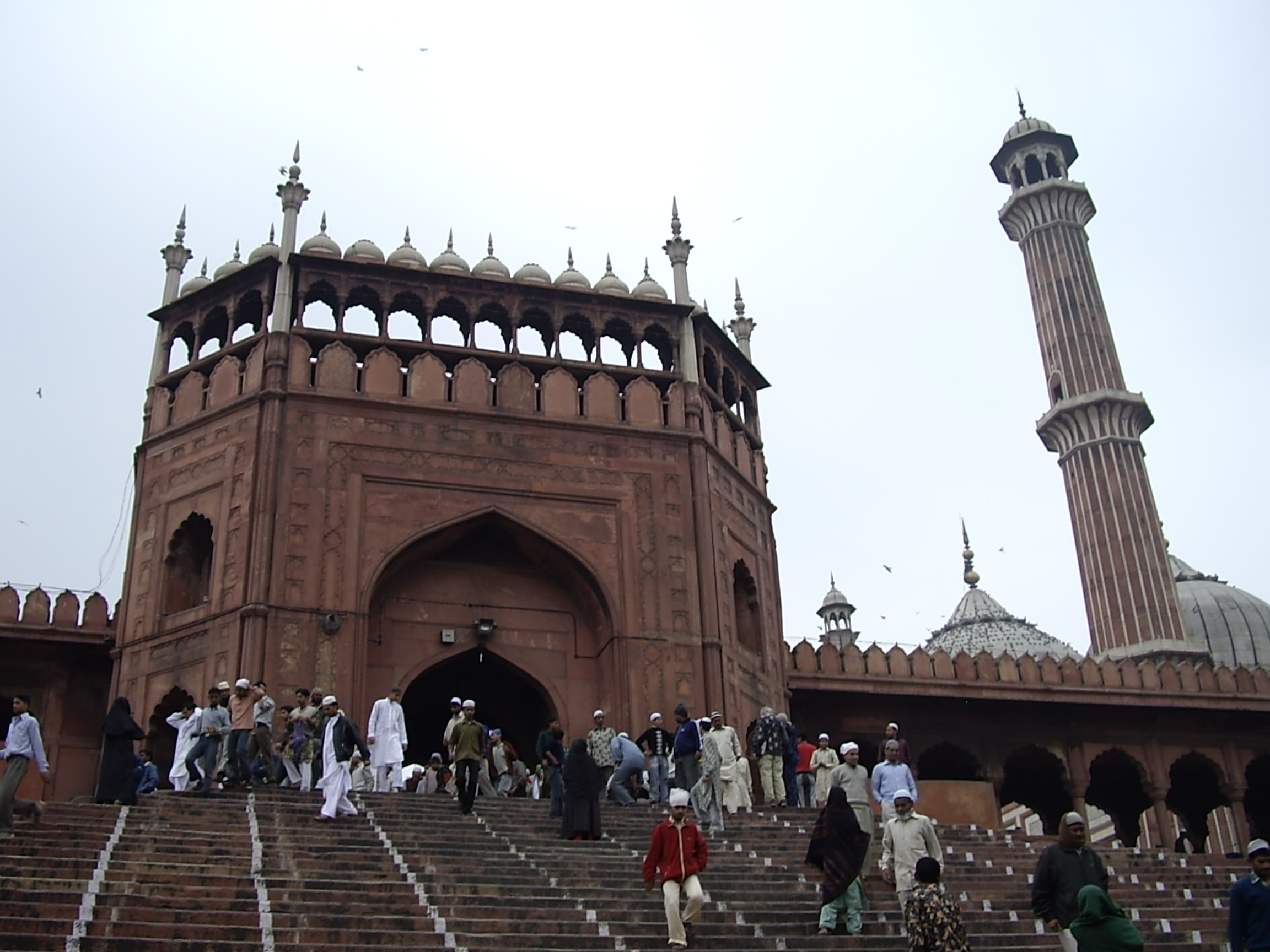 Τον Φεβρουάριο του 2007 βρέθηκα –για πολλοστή φορά- στο Δελχί. Και όπως συνηθίζω, περιπλανήθηκα με τις ώρες στο Παλαιό Δελχί. Την προηγούμενη φορά που είχα έλθει, είχα περπατήσει, θυμάμαι, γύρω στην μιάμιση ώρα από το κέντρο της πρωτεύουσας στο Νέο Δελχί για να έλθω εδώ. Τώρα είχα την ευκαιρία να χρησιμοποιήσω το καινούργιο μετρό. Η «κίτρινη γραμμή» με έφερε στην στάση «Chawri Bazar» (από το όνομα της αγοράς του 19ου αιώνα όπου πουλιούνται από μπακίρια μέχρι γυναικεία κοσμήματα, χαρτικά είδη και βιβλία και η οποία κάποτε στέγαζε εταίρες και χορεύτριες). Πρόκειται για την πιο βαθιά σκαμμένη στάση του μετρό της πόλης, κάπου στα 30 μέτρα κάτω από την επιφάνεια. Βγαίνοντας, η απόσταση είναι ελάχιστη και σύντομα φάνηκαν οι 2 χαρακτηριστικοί μιναρέδες, ύψους 41 μέτρων ο καθένας, του Jama Masjid. Παρότι έχω ξανάρθει δεν έχασα την ευκαιρία να επισκεφτώ το τζαμί άλλη μία φορά, πόσο μάλλον μια ημέρα που είχε συγκριτικά με τις υπόλοιπες ημέρες της εβδομάδας, τον περισσότερο κόσμο, αφού ήλθα Παρασκευή μεσημέρι, δηλαδή πάνω στην κύρια εβδομαδιαία προσευχή των μουσουλμάνων. Πρόκειται για το μεγαλύτερο τζαμί στην Ινδία και βρίσκεται απέναντι από το «Κόκκινο Φρούριο» το δε κανονικό όνομά του είναι Masjid-i Jahan-Numa («Το Τζαμί όπου καθρεφτίζεται ο Κόσμος»). Χτίστηκε μεταξύ 1644 και 1658 και αποτελεί τυπικό παράδειγμα αρχιτεκτονικής της εποχής του Shah Jahan το οποίο το έχτισαν 5.000 τεχνίτες. Οι σκάλες που φαίνονται στη φωτογραφία να οδηγούν στην ανατολική πύλη, σηκώνονται 10 μέτρα από το δρόμο και μέσα, η συνολική του έκταση είναι γύρω στα 2.000 τ.μ. και μπορεί σύμφωνα με τον τουριστικό οδηγό που πρόλαβα να διαβάσω στο μετρό ερχόμενος, να υποδεχτεί ακόμη και 25.000 κόσμο. Συνολικά, έχει 3 πύλες, τέσσερεις πύργους και 2 μιναρέδες με 130 σκαλιά τα οποία οδηγούν σε 41 μέτρα ύψος και σε παρατηρητήρια από όπου απλώνεται η πανοραμική θέα της παλιάς πόλης. Η ώρα που τελειώνει η μεσημεριανή προσευχή της Παρασκευής συμπίπτει με την πιο πολυάνθρωπη κίνηση στην περιοχή και γενικότερα στο Παλαιό Δελχί και το μποτιλιάρισμα ολόγυρα είναι κάτι παραπάνω από εμφανές. Η τυπική ισλαμική αρχιτεκτονική εκφράζεται μέσα από την γνώριμη «Mughal» αισθητική της Ινδικής Υποηπείρου, με κυρίαρχα το λευκό και το κόκκινο χρώμα και με βασικό υλικό τον ψαμμίτη. Άσπροι τρούλοι, ινδοσαρακήνικες γραμμές, καμάρες, σκεπαστές αψίδες με σκαλίσματα, λευκό μάρμαρο και βαριές σιδερένιες πύλες, όλα αυτά, μαζί με τον κόσμο που βλέπεις, την θέα, θέλουν τουλάχιστον μια ώρα για να σχηματίσεις μια όσο πιο πλήρη γίνεται εικόνα. Σχεδόν μία ώρα μετά, έφυγα με την εντύπωση ότι πράγματι πρόκειται για μια από τις πιο γοητευτικές γωνιές της ινδικής πρωτεύουσας ή όπως λεγόταν επί δυναστείας των Mughal οπότε και χτίστηκε, του Shahjahanbad.