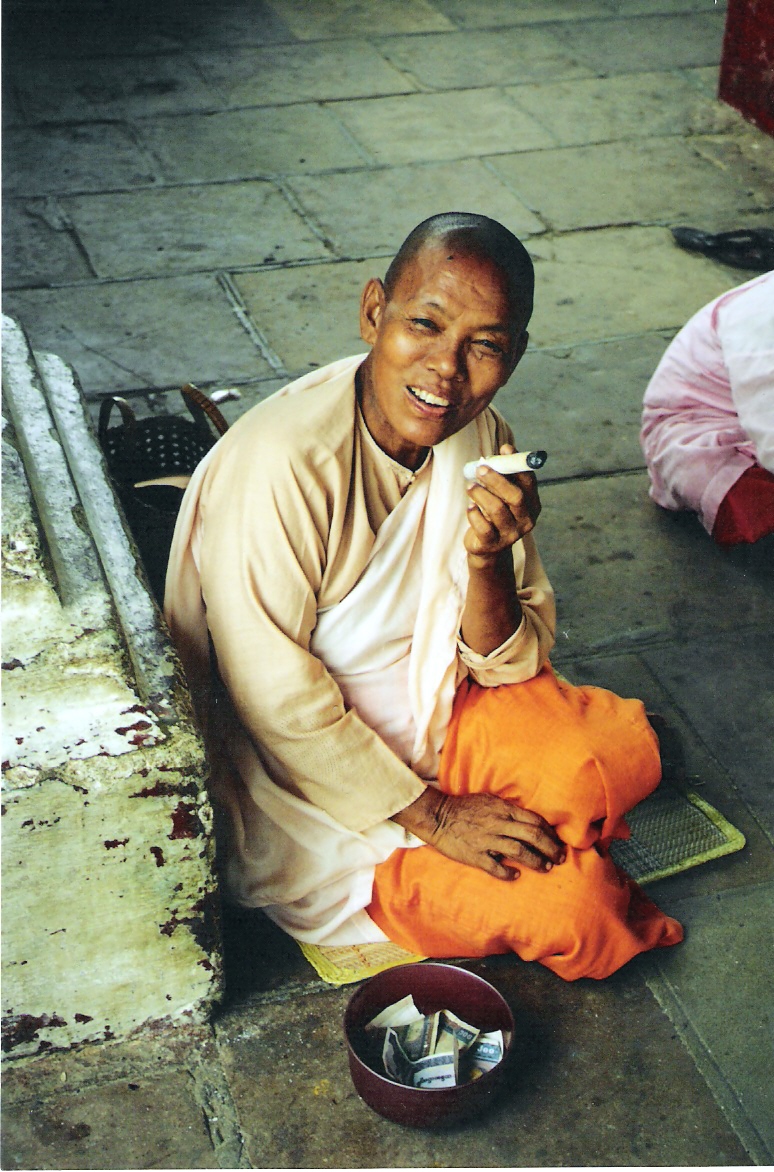 Μια χαρακτηριστική εικόνα από του βουδισμό των Βιρμανών που μου έχουν μείνει, είναι η «εις φάλαγγα κατ’ άνδρα» κομπανία των βουδιστών μοναχών, ντυμένοι με τις πορτοκαλί ρόμπες και με ξυρισμένα κεφάλια, να ζητούν φαγητό από καταστηματάρχες και νοικοκυραίους, προτείνοντάς τους το thabeig, το χαρακτηριστικό μαύρο μπωλ από όπου τρώνε οι βουδιστές μοναχοί και το οποίο το γεμίζουν κάθε ημέρα, πάντοτε ζητώντας και τους πολίτες να ανταποκρίνονται με προθυμία. Στη Βιρμανία όλοι οι άντρες πρέπει να περάσουν τουλάχιστον 2 εβδομάδες σε μοναστήρι. Είναι κάτι σαν τη δική μας στρατιωτική θητεία, η οποία όμως δεν είναι υποχρεωτική για όλους (για λόγους επιβίωσής του, το στρατιωτικό καθεστώς δέχεται στο στράτευμα μόνο οπαδούς του καθεστώτος).