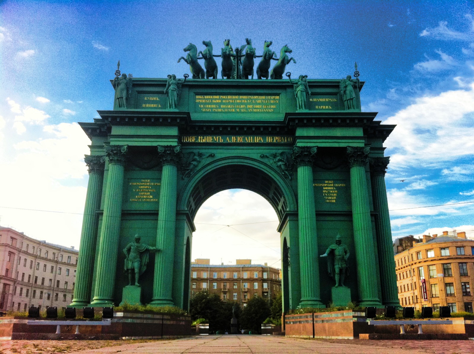 Αντικρίζοντας το θέαμα στην έξοδο του σταθμού μετά από ανέβασμα 52 μέτρων με κυλιόμενες σκάλες πάνω από την πλατφόρμα, διαπιστώνω ότι το θέαμα άξιζε τη συμπλήρωση και της ένατης από το πρωί ώρας διαρκούς μετακίνησης στα αξιοθέατα της Αγίας Πετρούπολης. Η αψίδα στα ρώσικα λέγεται На́рвские триумфа́льные воро́та, οπότε η επί λέξει μετάφραση πάει περισσότερο προς το «Πύλη» παρά το «Αψίδα». Κατασκευάστηκε το 1814 σε ανάμνηση της νίκης των Ρώσων κατά του Ναπολέοντα το 1812 προκειμένου να καλωσορίσει τους νικητές στρατιώτες, ενώ σκοπός ήταν και να αποτελέσει «απάντηση» στην Αψίδα του Θριάμβου που είχε στηθεί στο Παρίσι σε ανάμνηση της νίκης του Ναπολέοντα στο Αούστερλιτς. Ονομάστηκε Νάρβα όπως και η πλατεία, καθώς από εδώ ξεκινούσε ο δρόμος που οδηγούσε στην ομώνυμη πόλη της Εσθονίας.