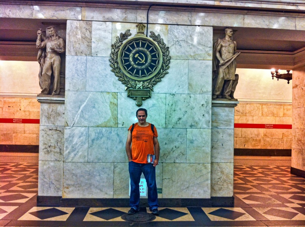 28 Αυγούστου 2013, τελευταία ημέρα παραμονής μου στην Αγία Πετρούπολη. Αποφασίζω να επισκεφθώ τη θριαμβική Αψίδα Νάρβα. Μετά από πολύωρο περπάτημα, παίρνω γύρω στις 5μμ το μετρό από τον σταθμό Νιέφσκι Πρόσπεκτ και την Μπλε Γραμμή με κατεύθυνση Νότια, προς Κούπτσινο. Δύο στάσεις μετά, κατεβαίνω στον σταθμό Τεχνολογικό Ινστιτούτο και παίρνω την κόκκινη γραμμή με κατεύθυνση νοτιοδυτική, που καταλήγει στο τέρμα Πρόσπεκτ Βετεράνοφ. Κατεβαίνω ξανά στη δεύτερη στάση, στον σταθμό Νάρβσκαγια, έναν από τους παλιότερους στην πόλη. Εγκαινιάστηκε στις 15 Νοεμβρίου 1955 και ονομαζόταν Πλάσαντ Στάτζεκ, δηλαδή Πλατεία Απεργιών. Βγαίνοντας από τον συρμό νομίζω πως κάνω ταξίδι στον παρελθόν και στη σοβιετική εποχή. Ολόγυρα βλέπω γλυπτά με σοβιετικούς θυρεούς, σφυροδρέπανα, ήρωες εργασίας, στρατιώτες, εργάτες και άλλα κλασικά μοτίβα σοσιαλιστικού ρεαλισμού, ταιριαστά με το όνομα που επρόκειτο αρχικά να δοθεί στον σταθμό, δηλαδή Σταλίνσκαγια, κάτι που δεν συνέβη, καθώς ο Στάλιν πέθανε τρεις μήνες πριν την τελική φάση κατασκευής του σταθμού. Δίκαια η σοβιετική αισθητική σε συνδυασμό και με τους ρετρό πολυέλαιους κατατάσσουν στις σχετικές λίστες τον Νάρβσκαγια ανάμεσα στους πιο ενδιαφέροντες σταθμούς παγκοσμίως.