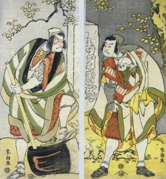 Οι ηθοποιοί Ichikawa Ebizo σε ρόλο μοναχού και Sakata Hangoro III στον ρόλο του Chinzei Hachiro no Tametomo, σε πόζα »μήε». Δίπτυχο πορτραίτο από τον Katsushika Hokusai (1791).