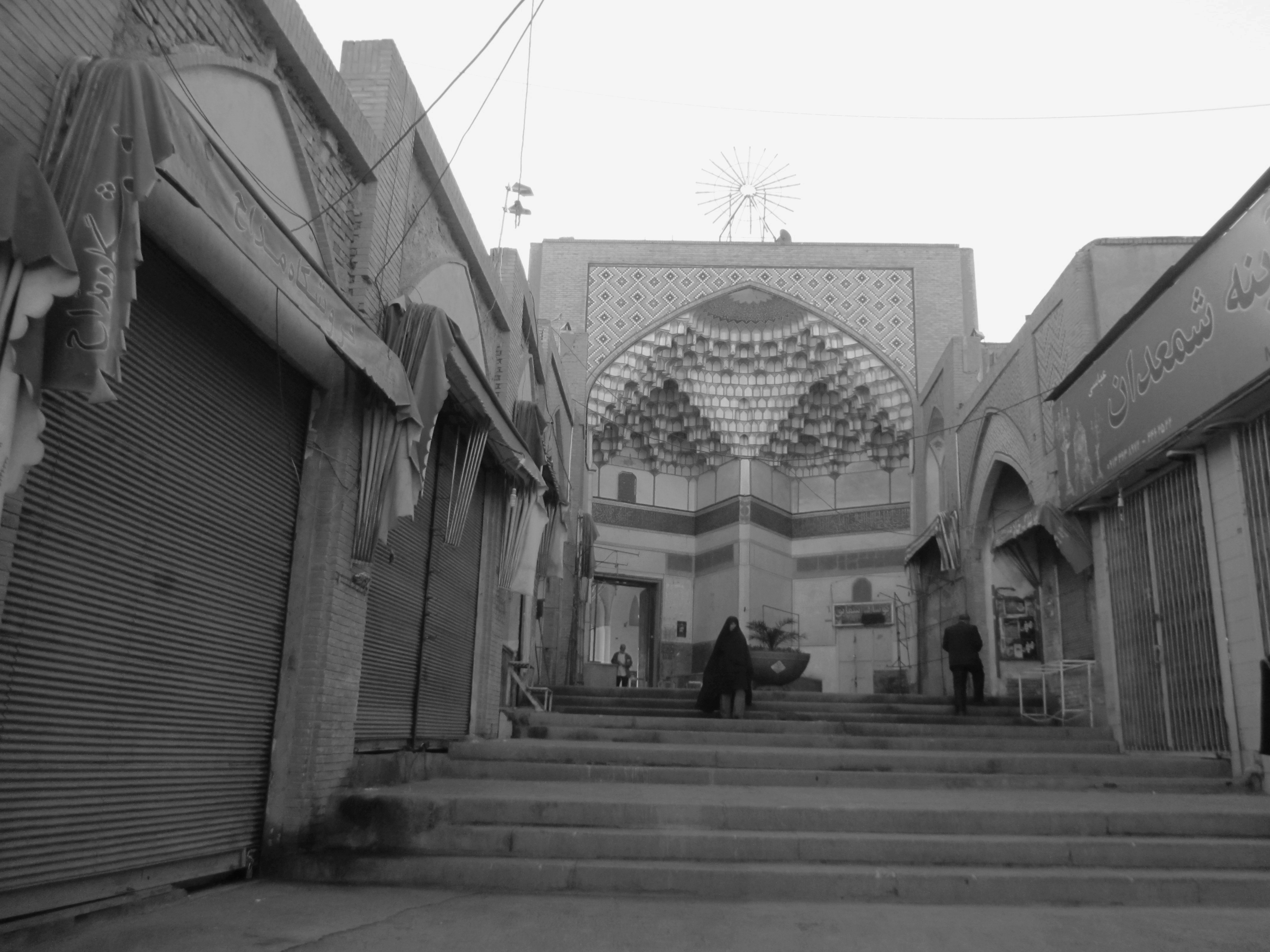 Από την εσωτερική πλευρά που βλέπει στο συγκρότημα της «Αγοράς των Χαλκωματάδων» (Bazar-e mesgarha) είχα προσέξει το προηγούμενο βράδυ ένα πλήθος από πύλες, επιγραφές, και αίθρια και χώρους σε διάφορα επίπεδα, όπως επίσης έναν θόλο από τούβλα και μια δεξαμενή νερού.