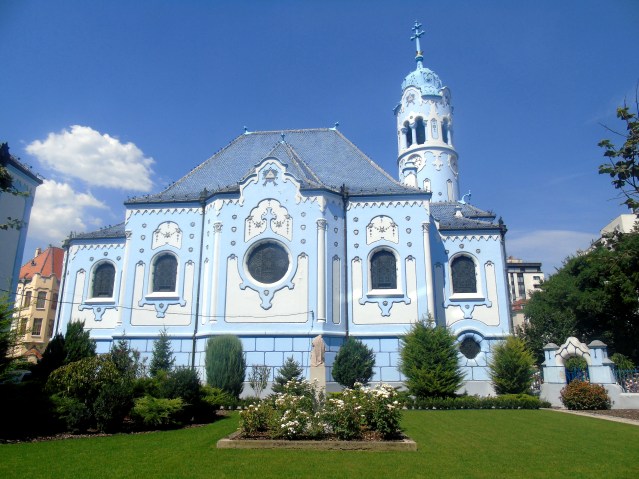 Η Μπλε Εκκλησία, Κεκ Τέμπλομ ουγγρικά και Μοντρί Κοστόλικ σλοβακικά, εγκαινιάσθηκε το 1913 και είναι αφιερωμένη στην Ελισάβετ της Ουγγαρίας, γι’ αυτό ονομάζεται Ναός της Αγίας Ελισάβετ (Κόστολ Σβέτεϊ Αλζμπέτι στα σλοβακικά και Σεντ Ερσέμπετ Τέμπλομ στα ουγγρικά). Η Ελισάβετ της Θουριγγίας, ήταν πριγκίπισσα της Ουγγαρίας, λανδγραβίνη της Θουριγγίας και Αγία, προστάτιδα του Τρίτου Τάγματος του Αγίου Φραγκίσκου του οποίου υπήρξε από τα πρώτα μέλη. Γεννήθηκε 7 Ιουλίου 1207 στην Μπρατισλάβα όταν αυτή ονομαζόταν Ποσζόνι και ανήκε στην Ουγγαρία. Πέθανε στις 17 Νοεμβρίου του 1231 στο Μάρμπουργκ της Θουριγγίας της τότε Αγίας Ρωμαϊκής Αυτοκρατορίας, το οποίο σήμερα ανήκει στο κρατίδιο της Έσσης με την γοτθική εκκλησία της Αγίας Ελισάβετ (η οποία χρησίμευσε ως μοντέλο για τον Καθεδρικό της Κολωνίας) να δεσπόζει πάνω από την πόλη. Η Ελισάβετ ανακηρύχθηκε αγία μόλις 3,5 χρόνια από τον θάνατό της, στις 27 Μαΐου του 1235 στην Περούτζια, από τον Πάπα Γρηγόριο ΙΧ, κατόπιν αρκετών μαρτυριών για θαύματα ιάσεων στον τάφο της, στον ναό του νοσοκομείου που έχτισε μετά τη χηρεία της σε ηλικία 20 ετών όταν πέθανε ο σύζυγός της Λουδοβίκος ο λανδγράβος της Θουριγγίας.