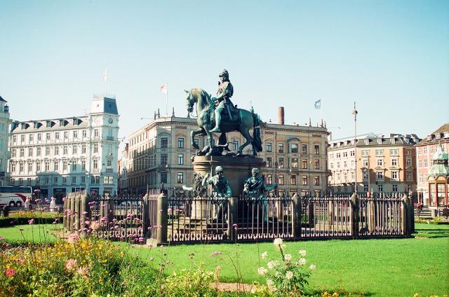 Το 1688 αναγέρθηκε το άγαλμα του εν ζωή ακόμη 44χρονου βασιλιά Χριστιανού Ε’ που περισσότερο θυμίζει Ρωμαίο αυτοκράτορα. Πρόκειται για το παλιότερο άγαλμα έφιππου σε ολόκληρη τη Σκανδιναβία. Είναι στημένο στη μέση ενός κήπου μπαρόκ αισθητικής με παρτέρια και δένδρα. Αρχικά ήταν από επιχρυσωμένο μολύβι, για να αναμορφωθεί το 1939 σε μπρούτζινο λόγω του βάρους που δέχονταν τα πόδια του αλόγου, των οποίων η στάση με το δεξιό μπροστά και το αριστερό πίσω σε ταυτόχρονη κίνηση προς τα εμπρός απεικονίζει το τρέξιμο «τροτ». Τρέξιμο κατά το οποίο, αν και δεν θεωρείται και το δυσκολότερο σε σύγκριση με τον «καλπασμό» ή με το «ταχύ τροτ», οι αναβάτες οφείλουν να συντονίζονται με το άλογο ώστε να σηκώνονται και να κάθονται την κατάλληλη στιγμή.