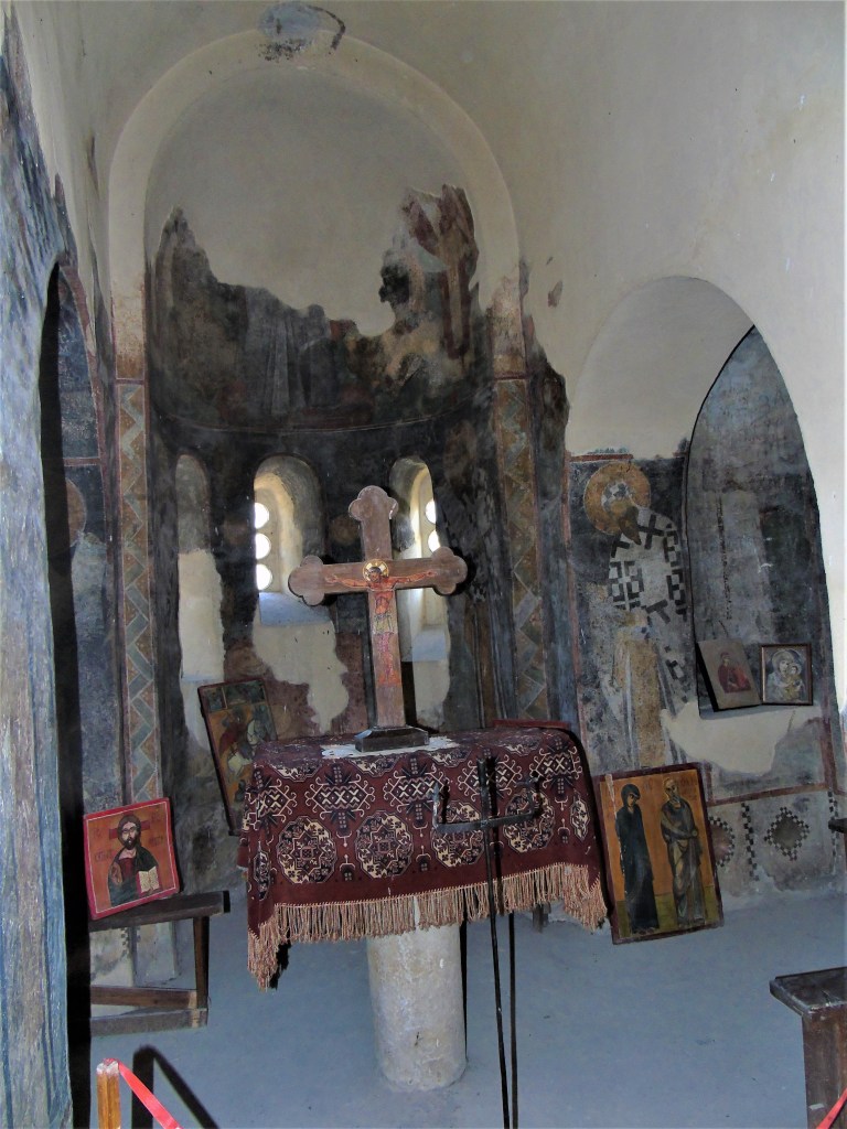 Το θέαμα με αποζημιώνει με το παραπάνω για τη μεσημεριανή καλοκαιριάτικη ανάβαση. Εισερχόμενος στην εκκλησία της Θεομήτορος του 12ου (κατ’ άλλους, του 13ου) αιώνα, το δέος είναι διπλό. Μυστικιστικό λόγω περιβάλλοντος και αισθητικό λόγω της εξαιρετικής βυζαντινής αρχιτεκτονικής, με τις καμάρες, τα τούβλα και την πέτρα να κυριαρχούν ως σχήμα και υλικό. Χαμηλός φωτισμός, μεταλλικά μανουάλια και τα σωζόμενα τμήματα των μεσαιωνικών, του 14ου αιώνα, τοιχογραφιών, μεταξύ των οποίων ξεχωρίζουν η Κοίμηση της Θεοτόκου, η Βάπτιση, οι Σαράντα Μάρτυρες της Σεβάστειας, οι Ισαπόστολοι Κωνσταντίνος και Ελένη. Όλα εξαιρετικά δείγματα της Παλαιολόγειας τέχνης, δίνουν ένα υποβλητικό χρώμα.