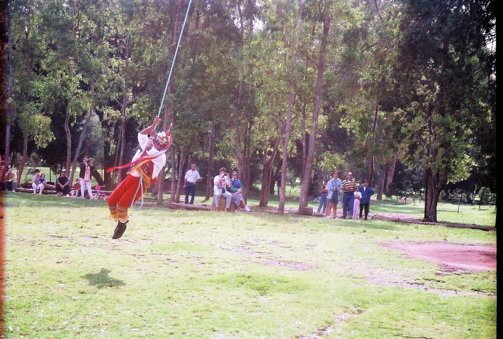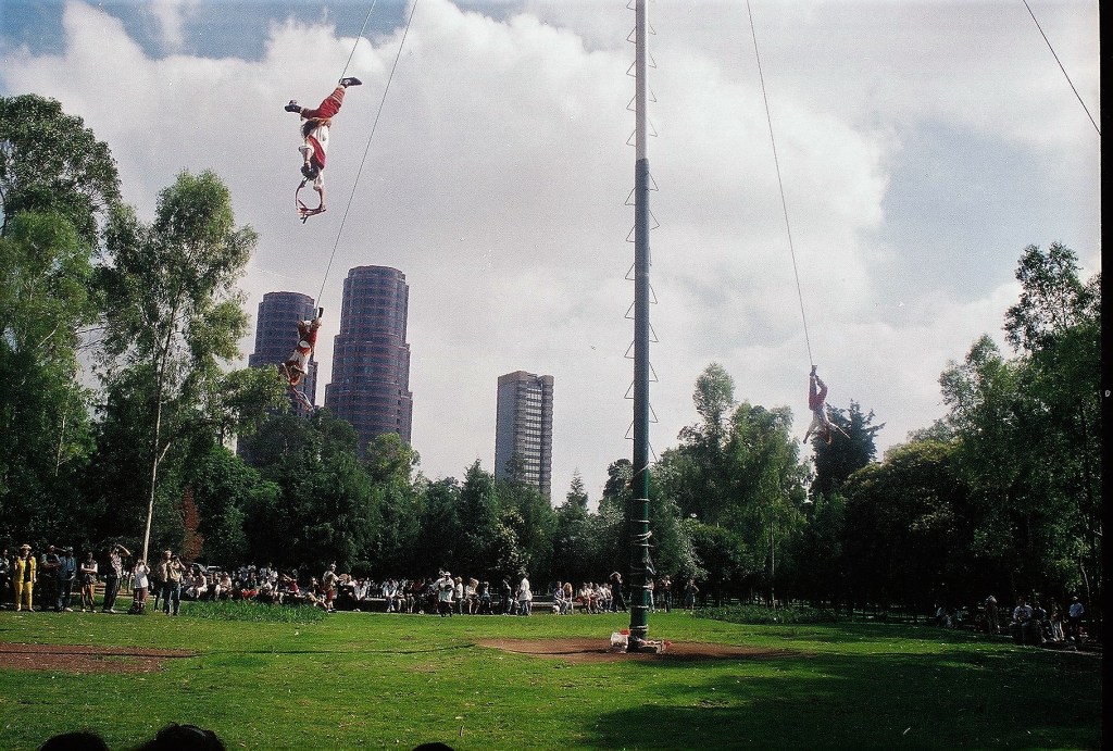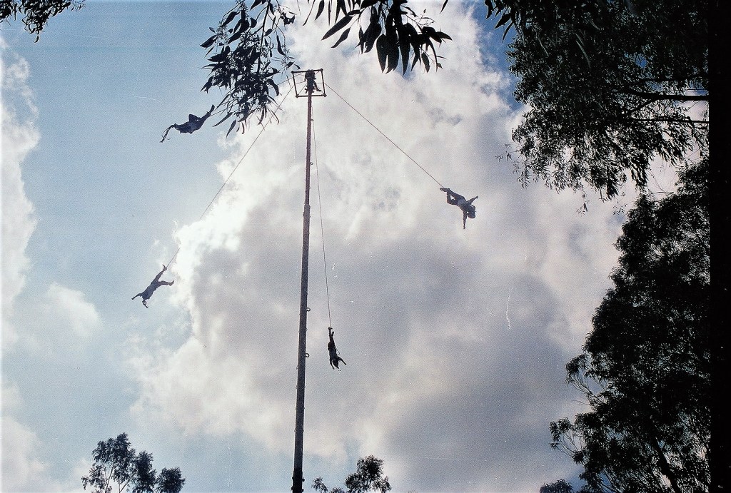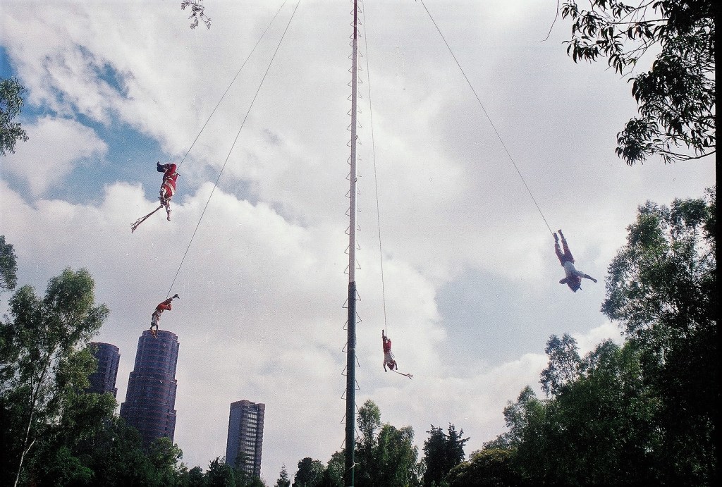Περπατώντας στον Λόφο των Ακρίδων, το Τσαπούλτεπεκ στη ναουάτλ, την γλώσσα των Αζτέκων που μιλούν 1,8 εκατομμύριο Μεξικανοί στις κεντρικές πολιτείες, ακούγεται ήχος φλάουτου, σύνθημα έναρξης της Ντάνζα ντε λος Βολαδόρες, του «Χορού των Ιπταμένων». Εμφανίζονται πέντε άνδρες με λευκή και κόκκινη ενδυμασία και πολύχρωμα καπέλα, σε έναν συμβολισμό ήλιου και ουράνιου τόξου. Χορεύουν κουνώντας ώμους και άκρα και ανεβαίνουν στον στύλο. Οι τέσσερις, οι οποίοι παριστάνουν τις τέσσερις εποχές, δένονται με σχοινιά από την εξέδρα της κορυφής στα 30 μέτρα όπου έχουν σκαρφαλώσει. Ο πέμπτος, ο Καποράλ, παίζει φλάουτο και χτυπά από την κορυφή το τύμπανο.