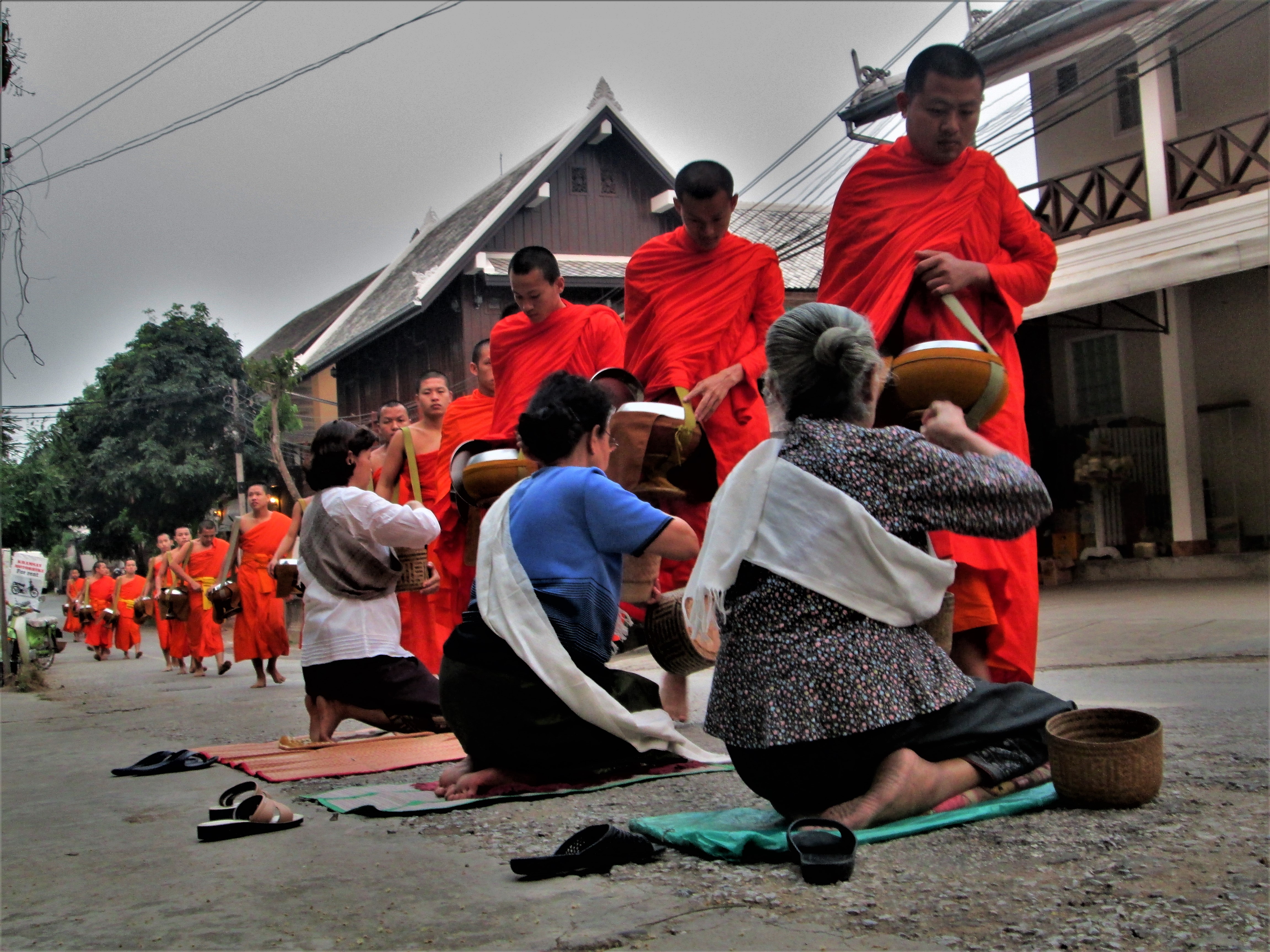Ώρα 6:30. Σε μικρή απόσταση, επί της Κουονσουά, περιμένει μία ακόμη τριάδα γυναικών μέσης ηλικίας. Το τυπικό εδώ κρατά περισσότερη ώρα, καθώς πρόκειται για κύριο δρόμο και περνούν περισσότεροι μοναχοί. Για εμάς είναι πολύ νωρίς ακόμη, για τους μοναχούς όμως είναι προχωρημένη ώρα. Ξυπνούν μεταξύ 3 και 4 και κατευθύνονται στον ναό για προσευχή. Κατοπιν αναχωρούν ομαδικώς από τους 35 ναούς της πόλης προς το κέντρο της για ελεημοσύνη. Επιστρέφοντας, το περιεχόμενο των μπωλ μοιράζεται σε όλους σε δύο κοινά γεύματα, πρωί και μεσημέρι. Θα φάνε πάλι το επόμενο πρωί. Πολλοί μοναχοί είναι παιδιά, συχνά φτωχών οικογενειών ή πολυμελών, κυρίως απομακρυσμένων περιοχών. Το Λάος δεν είναι πλούσια χώρα, είναι δε η μοναδική περίκλειστη μεταξύ των συνολικά 11 της Νοτιοανατολικής Ασίας. Στα μοναστήρια βρίσκουν τροφή και εκπαίδευση. Η δε αλληλεγγύη είναι ζωντανή παράδοση. Ναοί και μοναστήρια προσφέρουν στην κοινότητα, η κοινότητα προσφέρει την εωθινή ελεημοσύνη και οι μοναχοί ανταποδίδουν, και πάντως όχι μηχανικά. Την ώρα της ελεημοσύνης διαλογίζονται για καλό κάρμα και καλοτυχία των προσφερόντων.