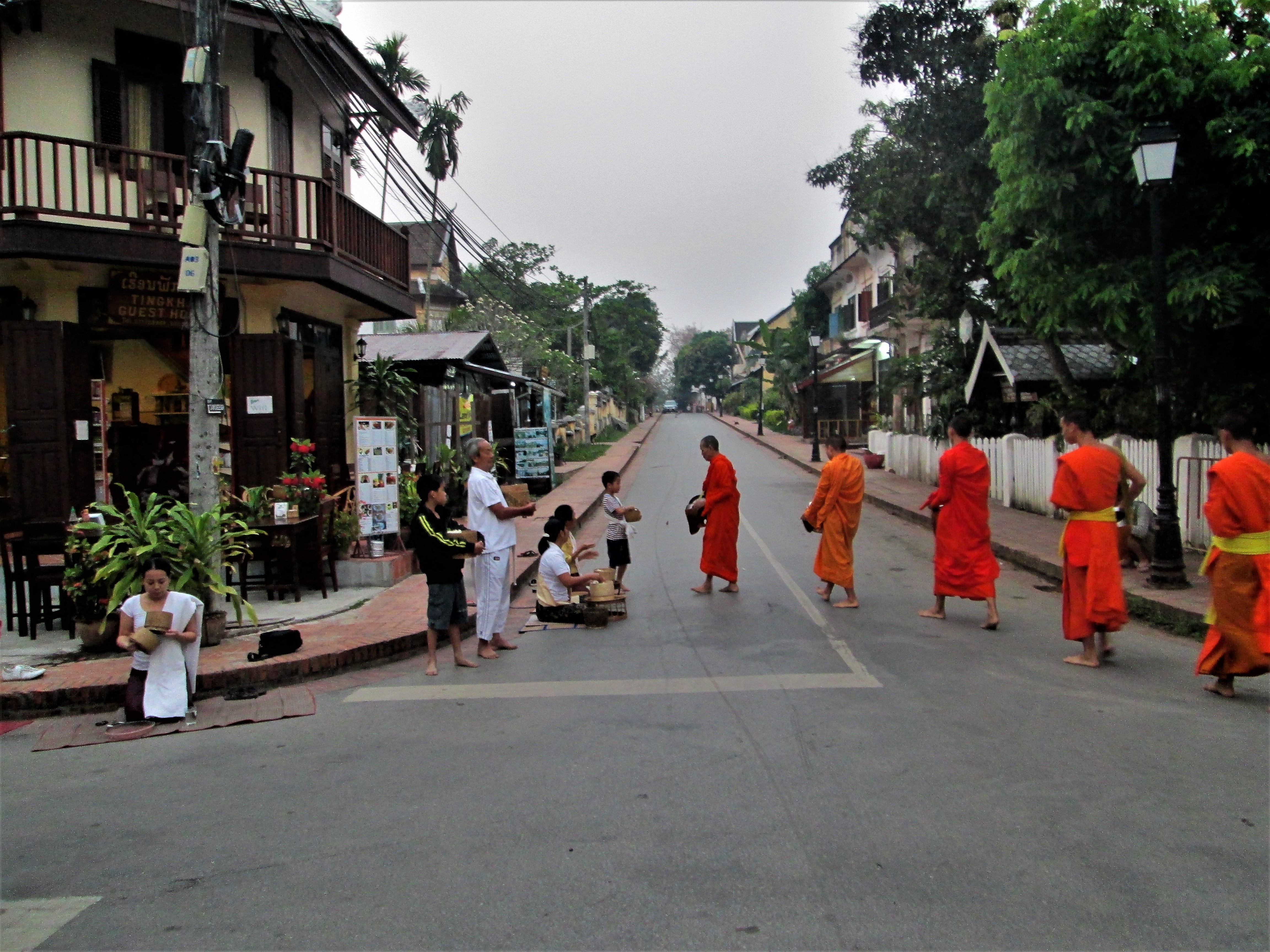 Σάββατο 16 Μαρτίου 2013, ώρα 6 π.μ. Πάνε 11χρόνια αφότου είχα δει την ιδιότυπη εωθινή ελεημοσύνη μοναχών στο Νυαούνγκσβε της γειτονικής Μυανμάρ. Είμαι τυχερός, καθώς το ξενοδοχείο όπου μένω στο Λουάνγκ Πραμπάνγκ βρίσκεται σε σταυροδρόμι από όπου περνούν διαφορετικές πομπές. οπότε μπορώ να δω το τυπικό εις το πολλαπλούν. Στον δε πίσω δρόμο, τη Σακκαλίν, περνά επίσης μεγάλη πομπή.