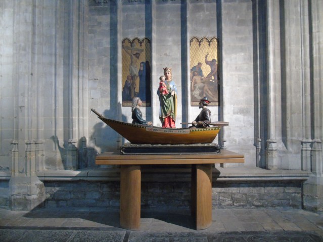 Το εσωτερικό είναι γαλλικό μπαρόκ. Την αυστηρότητα, τα μουντά χρώματα και το σκοτάδι σπάνε τα υπέροχα χρωματιστά βιτρό που δεν κουράζομαι να θαυμάζω. Δυστυχώς, το άγαλμα της Παναγίας που ήρθε με βάρκα προ 670 χρόνων το κατέστρεψαν το 1565 καλβινιστές. Σώζονται όμως τοιχογραφίες του 1435 και τα παρεκκλήσια της συντεχνίας των στρατιωτικών, του Αγίου Μακλοβίου (Μακλού όπως ονομάζεται εδώ ο Ουαλός Άγιος Μαλό ή Μαχούτους Μάλο στα ουαλικά), πρώτου επισκόπου του Αλέ της Βρετάνης, και των Τουρν Ουντ Τάξις. Και, βεβαίως, ένα γλυπτό με τη βάρκα, τη Βεατρίκη Σούουτκενς, τον σύζυγό της και την Παναγία.