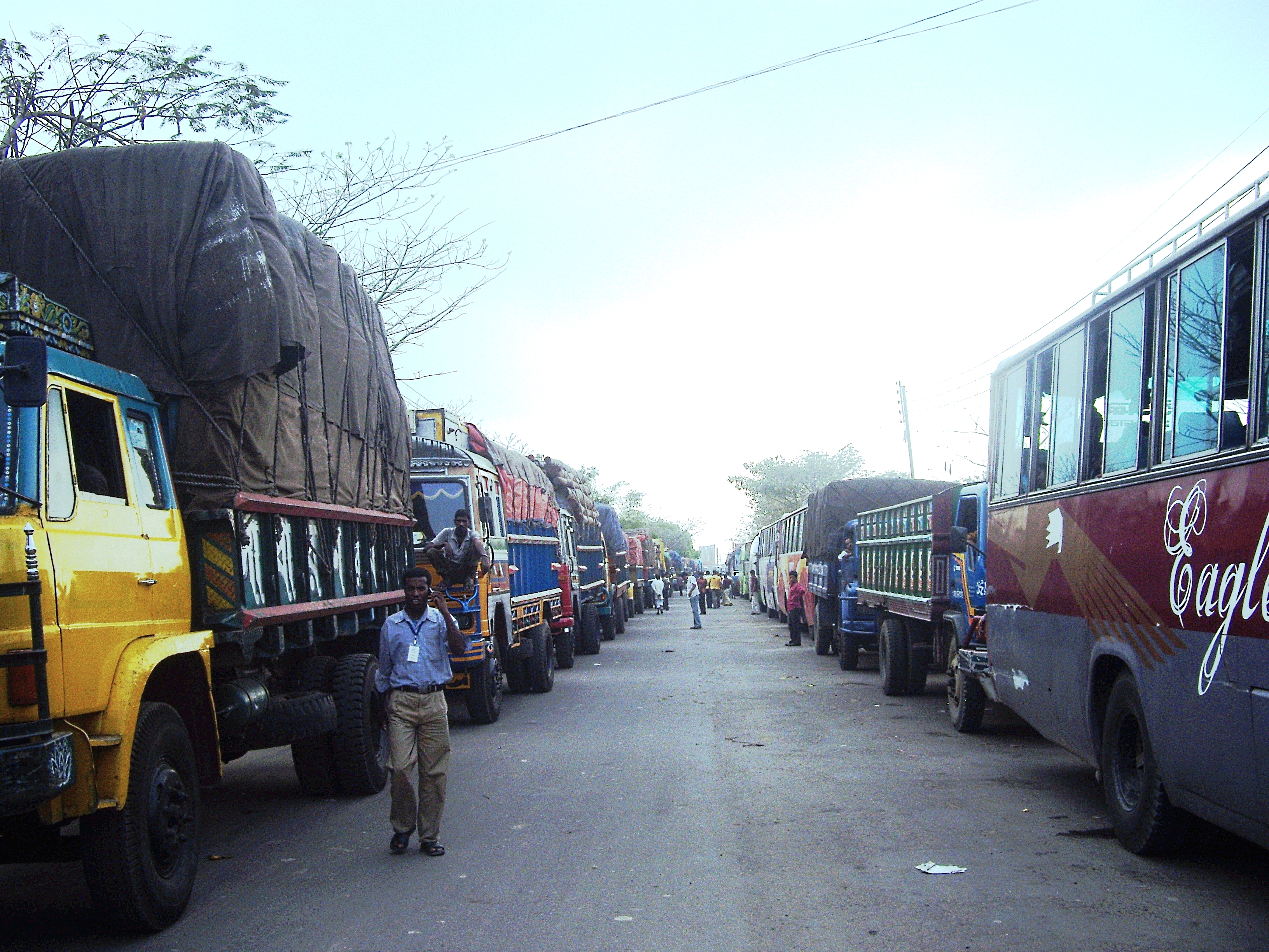 Σιγά – σιγά πέρασε η ώρα και φτάσαμε επιτέλους στα σύνορα, για να βρεθώ στις συνήθεις ουρές που σχηματίζονται στο μεγαλύτερο ποταμίσιο συνοριακό σταθμό της Ασίας να τρέχω για ακόμη μία φορά γι’ αυτές τις ανιαρές διατυπώσεις: βίζες, διαβατήρια, συνάλλαγμα, συμπλήρωση των «immigration forms» που μας μοίρασαν οι οδηγοί, ένα εξόδου από την Ινδία στη Χαριντασπούρ (αν και ως Έλληνας πιο εύκολο μου ήταν να θυμάμαι τη συνοριακή αυτή πόλη με το άλλο της, το πιο «ελληνίζον» όνομα: Πετρούπολη: Petrapole) και ένα εισόδου στα σύνορα του Μπανγκλαντές, στην Benapole. Και σαν να μην έφταναν τα δύο λεωφορεία, ένα από την ινδική μεριά και ένα από την μπαγκλαντεσιανή (στο οποίο η ώρα πέρασε πάλι χαζεύοντας μουσικοχορευτικά κομμάτια από τον κινηματογράφο) και οι συνοριακές γραφειοκρατικές διατυπώσεις, ήλθε η ώρα να εμπλουτιστεί η εμπειρία του ταξιδιού και με φέρυ.