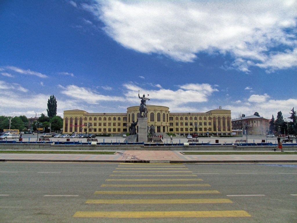 Το ενδιαφέρον μου προκάλεσαν όμως και τα κτήρια γύρω από την πλατεία. Κυρίως δε το επίμηκες ανοιχτού μπεζ χρώματος Δημαρχιακό Μέγαρο του 1933 στα ανατολικά (τυπικό δείγμα σοβιετικής αρχιτεκτονικής, ξαναχτίστηκε μετά τον σεισμό του 1988 με βάση το αρχικό του σχέδιο), η εκκλησία του Σωτήρος στα νότια και της Παναγίας στα βόρεια με τους χαρακτηριστικούς τρεις μυτερούς τρούλους, αμφότερες του 19ου αιώνα, ο κινηματογράφος Οκτώβριος του 1926, ο παλιότερος στην πόλη, με τη νεοκλασσική αρχιτεκτονική, τα ιωνικά κιονόκρανα και τα αετώματα επίσης στη βόρεια πλευρά και ένα ιδιαίτερα γραφικό αρχιτεκτονικά ξενοδοχείο το οποίο χτίστηκε το 1927 στο δυτικό άκρο της πλατείας.