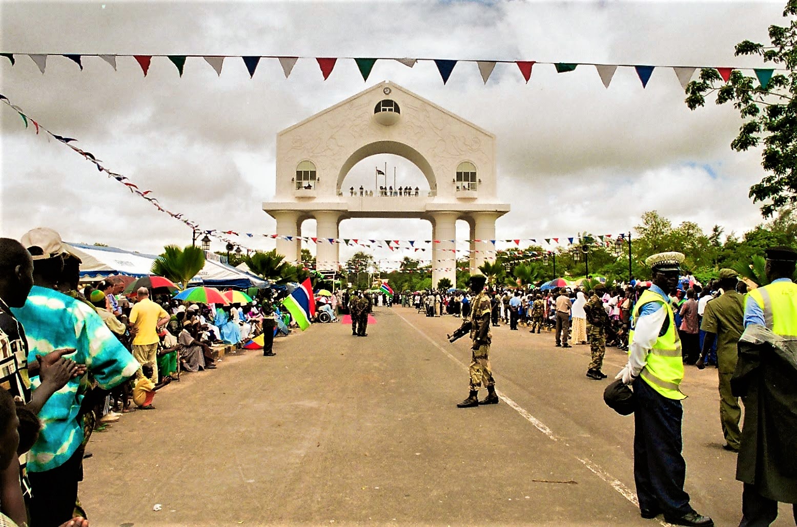 Η αψίδα βασίζεται σε οκτώ κολόνες και έχει τρεις ορόφους. Ο πρώτος βρίσκεται στις κολόνες, ο δεύτερος προσφέρει πανοραμική θέα της πόλης μέχρι το λιμάνι, ενώ στο τρίτο φιλοξενείται μουσείο υφαντών. Δεν έχει τίποτε το πομπώδες, ωστόσο είναι έξυπνα κατασκευασμένη και με φιλική όψη, όπως και οι Γκαμπιανοί, οι οποίοι μου αφήνουν τις καλύτερες εντυπώσεις με την καλοσυνάτη τους διάθεση. Όπως ο αστυνομικός που καβαλάει μια μοτοσικλέτα ανοίγοντας έτσι δρόμο για να απεγκλωβιστώ και να συνεχίσω τη διαδρομή μου.