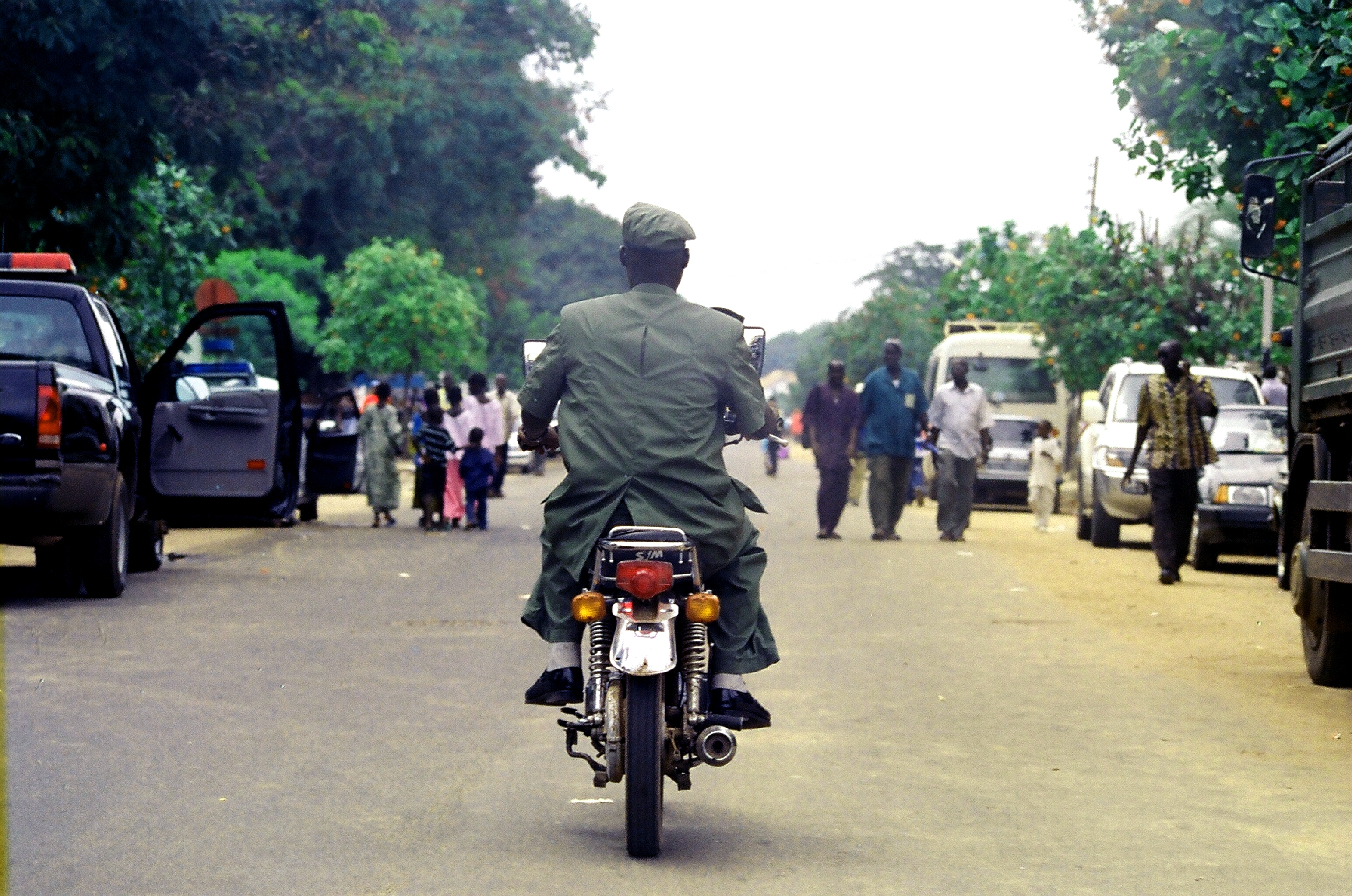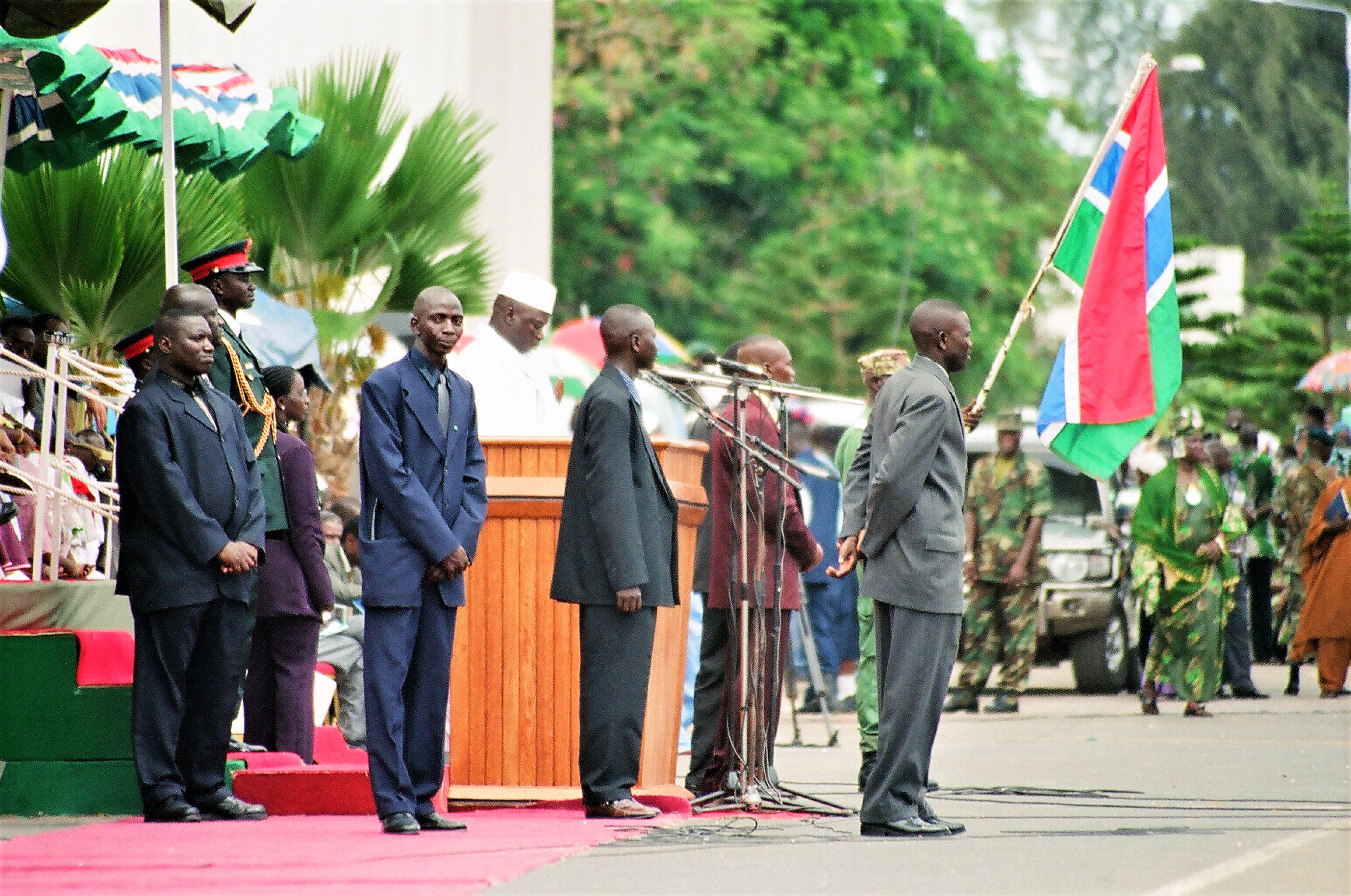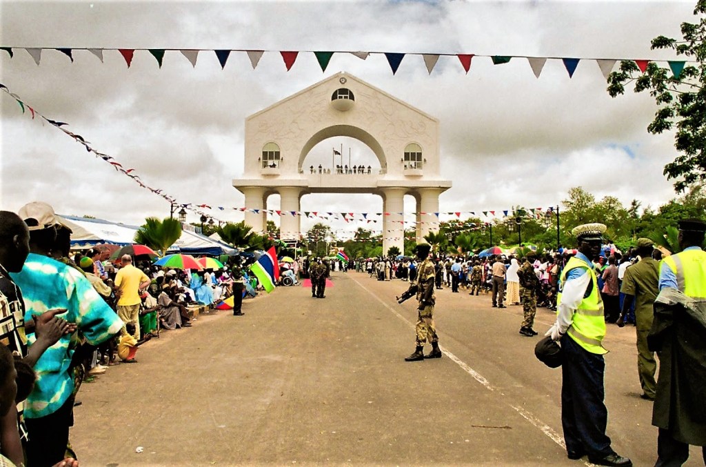 Ένας ένστολος με πληροφορεί πως εορτάζεται η ένατη επέτειος στην εξουσία του Γιαχία Τζαμέ. Από τα λίγα που θυμάμαι με όσα διάβασα πριν έλθω, κατέλαβε την εξουσία το 1994 με πραξικόπημα, δύο χρόνια αργότερα εξελέγη πρόεδρος, για να επανεκλεγεί το 2001, και με το κόμμα που ίδρυσε ο ίδιος να αποκτά το 1997 κοινοβουλευτική πλειοψηφία σε αμφιλεγόμενης διαδικασίας εκλογές.