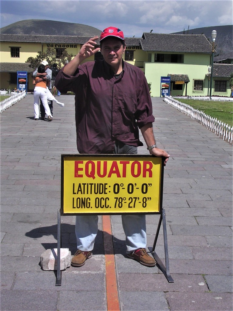 Η επίσκεψη εδώ μου δίνει την ευκαιρία για ψυχαγωγία. Μια ομάδα τουριστών με καλεί να παίξουμε βόλεϊ με νοερό φιλέ πάνω από την κίτρινη γραμμή του Ισημερινού. Βόρειοι – Νότιοι. Πιο πέρα, μερικοί πειραματίζονται με έναν φορητό νιπτήρα και τη «Δύναμη Κοριόλις». Πρόκειται για τον νόμο ότι κάθε κίνηση στο βόρειο ημισφαίριο εκτρέπεται προς τα δεξιά και στο νότιο προς τα αριστερά, κάτι που εμφανίζεται στις κυκλικές τροχιές των ανέμων αλλά και στη ροή του νερού. Έτσι, στον φορητό νιπτήρα, με το που βγάζει την τάπα ο παρουσιαστής, το νερό περιστρέφεται δεξιόστροφα λίγα μέτρα νοτίως της γραμμής, αριστερόστροφα βορείως και χωρίς στροφή, με μια ανεπαίσθητη παλινδρόμηση εμπρός – πίσω στο όριο Βορρά – Νότου.