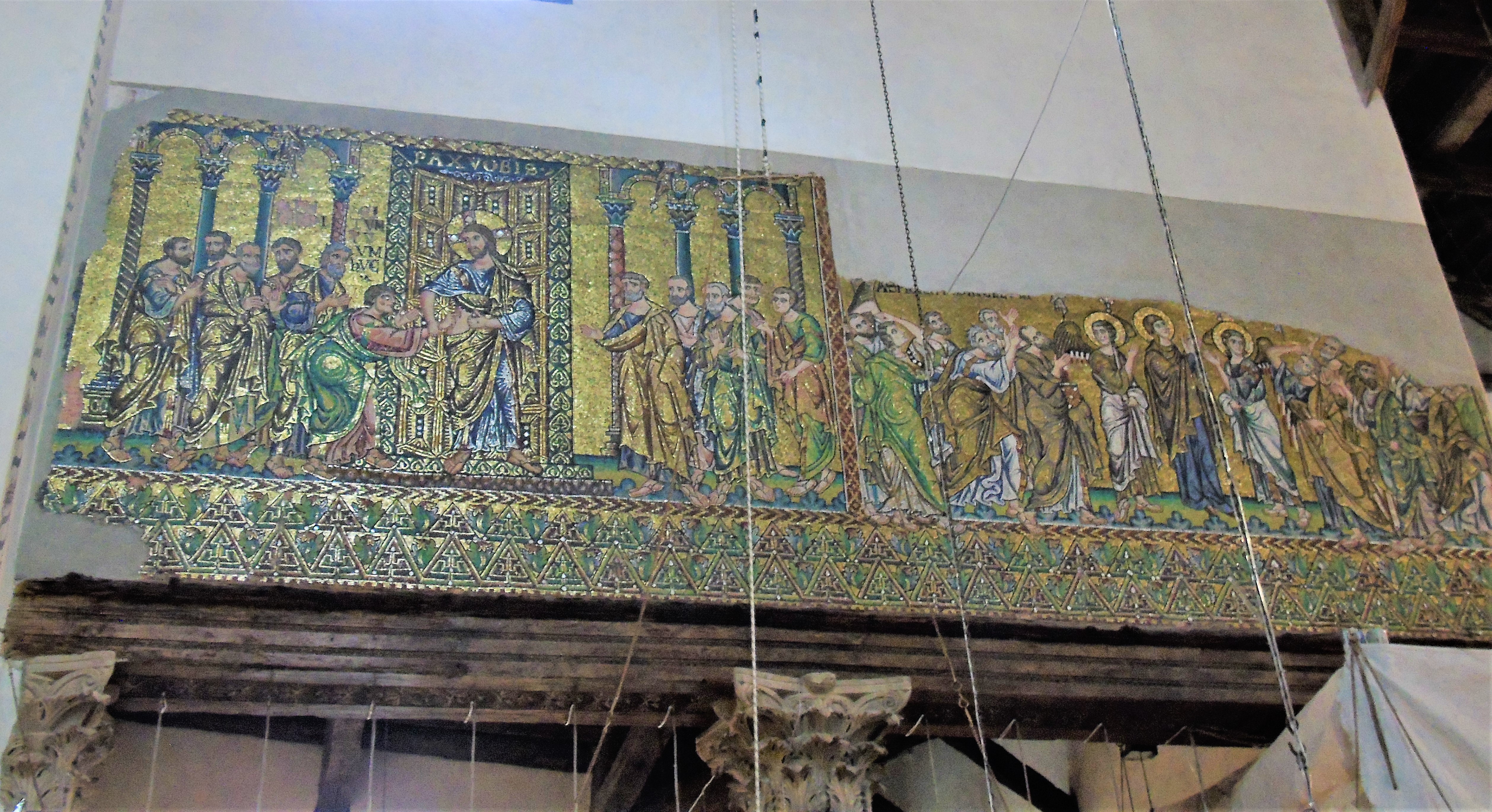 Σε σύγκριση με την πρώτη φορά που είχα επισκεφθεί τον σταυρόσχημο ναό, η αρχική εντύπωση καθώς εισέρχομαι είναι διαφορετική. Χάρη στις εργασίες συντήρησης, έχουν αποκαλυφθεί όσα από τα μωσαϊκά μπορούσαν να διασωθούν. Χρυσαφί, φωτεινό πράσινο, έντονο μπλε και ισορροπημένη χρήση θερμών και ψυχρών χρωμάτων πάνω στο λευκό φόντο του τοίχου αιχμαλωτίζουν αμέσως τη ματιά. Ξεχωρίζουν επτά ψηφιδωτοί άγγελοι, καθένας ανάμεσα σε μονόλοβα παράθυρα, και ο Αναστάς Χριστός ανάμεσα σε δύο πεντάδες μαθητών, με τον Θωμά να αγγίζει τα σημάδια της σταύρωσης υπό την επιγραφή «PAX VOBIS», τη λατινική απόδοση του «Ειρήνη υμίν», ένα υπέροχο ψηφιδωτό του 12ου αιώνα. Υπάρχουν όμως και επιδαπέδια ψηφιδωτά, τα οποία αποκαλύφθηκαν το 1965, όταν ανασκαφές αποκάλυψαν το πραγματικό δάπεδο του ναού. Η βασιλική είναι πεντάκλιτη και διαθέτει τέσσερις κιονοστοιχίες, με συνολικά 48 επιβλητικούς κίονες κορινθιακού ρυθμού, ύψους 5,50 μέτρων ο καθένας.