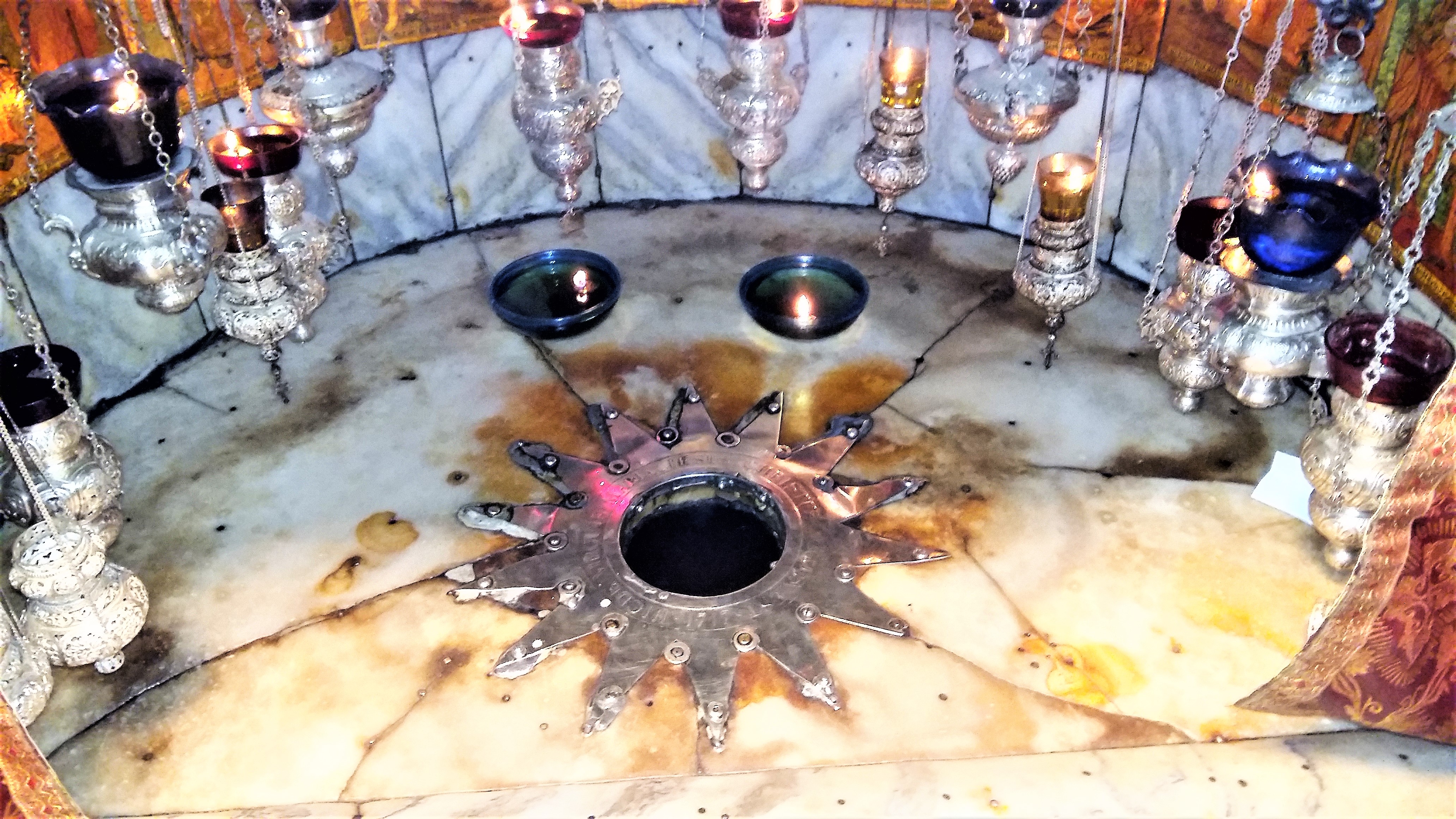 Την πρώτη φορά που είχα έλθει εδώ ήμουν μόνος μου στο σπήλαιο. Σήμερα έχουν φτάσει πλήθη τουριστών από όλες τις ηπείρους. Στέκομαι τυχερός καθώς για κάποιον αδιευκρίνιστο λόγο μεσολαβούν ελάχιστα λεπτά της ώρας χωρίς να έρχονται γκρουπ τουριστών, κάτι ασυνήθιστο αν κρίνω από τις διηγήσεις για δίωρες και τρίωρες αναμονές τις «κανονικές» ημέρες και για πολύωρες ατελείωτες ουρές την περίοδο των Χριστουγέννων. Το ακριβές σημείο της Γεννήσεως υποδεικνύεται από ένα ασημένιο άστρο στο δάπεδο με 14 ακτίνες. Ο συμβολισμός είναι πολλαπλός. Το «Άστρο της Βηθλεέμ» δεν βρίσκεται ψηλά, αντίθετα χρειάζεται να σκύψεις για το δεις, σε μια σχέση αμφίδρομης ταπεινοφροσύνης ανθρώπινου και θείου. Οι 14 ακτίνες συβολίζουν τις 14 γενεές από τον Αβραάμ ώς τον Δαυίδ, τις 14 γενεές από τον Δαυίδ ώς την βαβυλώνια αιχμαλωσία και τις 14 γενεές από την βαβυλώνια αιχμαλωσία ώς τη γέννηση του Χριστού.