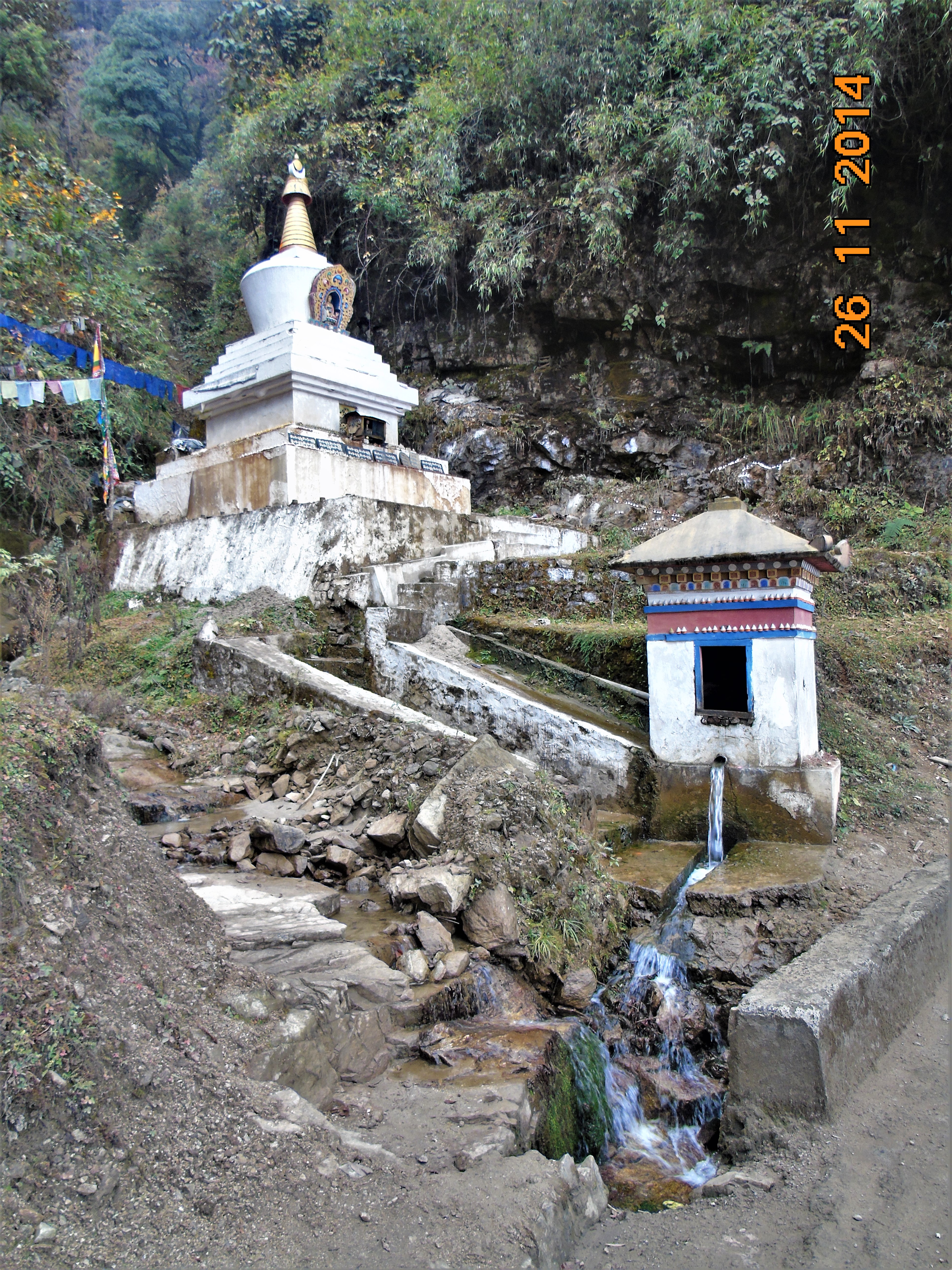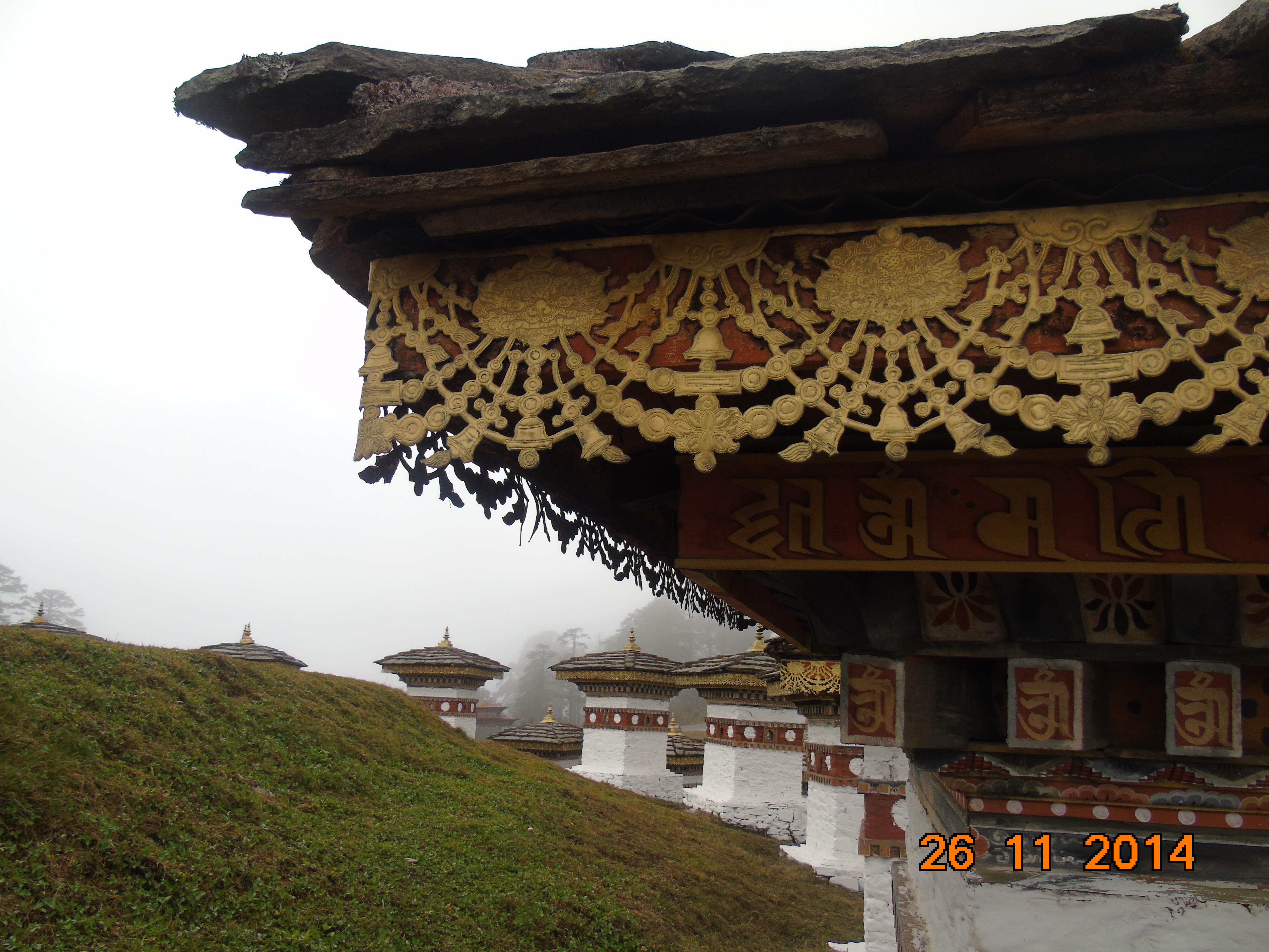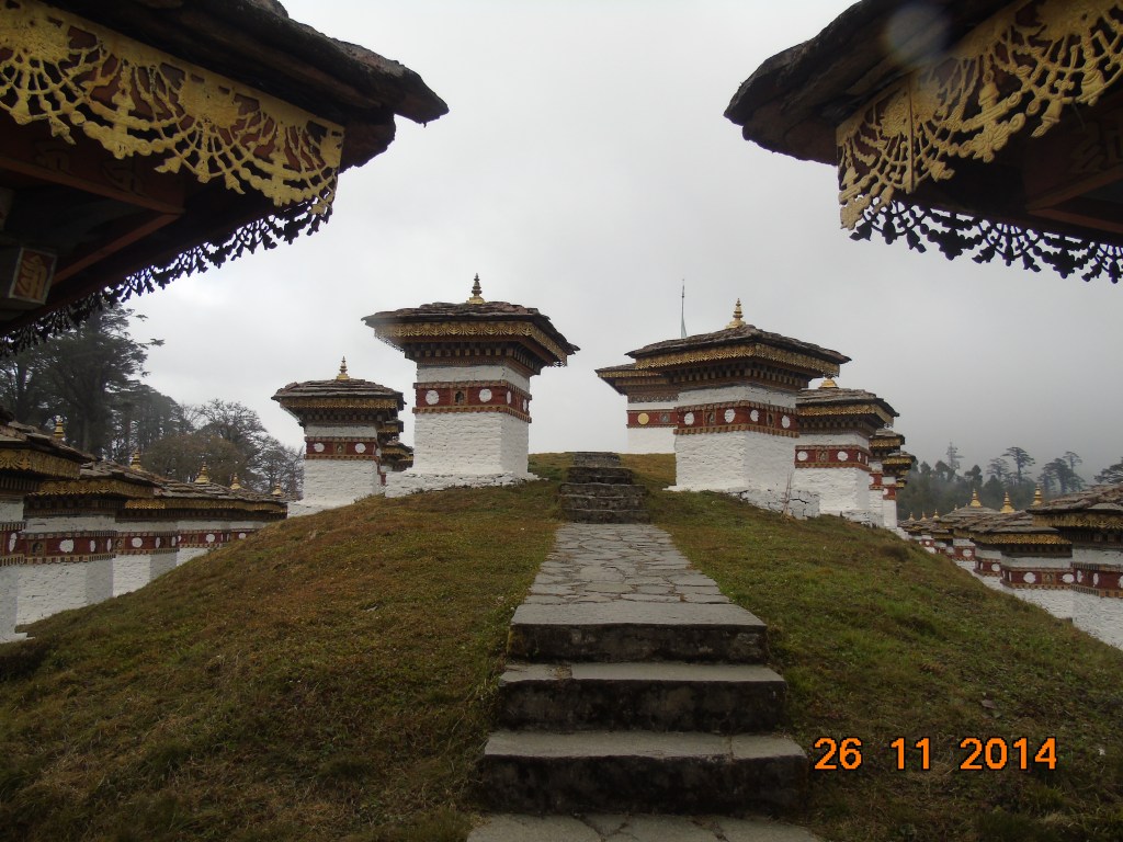 Τετάρτη 26 Νοεμβρίου 2014. Δεν έχει πολλή ώρα που ξημέρωσε και κατευθυνόμενος από το Τιμπού για την Πουνάκα σταματώ στο πέρασμα Ντότσουλα, στα 3.150 μέτρα υψόμετρο και στο σημείο όπου έχουν ανεγερθεί τα 108 τσόρτεν. Το θέαμα είναι μοναδικό με το δραματικό τοπίο που συνθέτει στα ανατολικά το ύψους 7.158 μέτρων όρος Μασανγκάνγκ, που είναι και το υψηλότερο της χώρας, γνωστό στην τοπική γλώσσα και ως όρος Γκάνγκαρ Πουενσούμ. Για καλή μου τύχη, η πυκνή ομίχλη που είχε σχηματιστεί τα ξημερώματα αρχίζει σταδιακά να διαλύεται επιτρέποντάς μου έτσι να έχω τουλάχιστον την ορατότητα που απαιτείται για να εκτιμήσω και να απολαύσω τη θέα. Ενδιαφέρον όμως αποδεικνύεται και το μοναστήρι Ντρουκ Γοαυνγκυάλ Λακάνγκ, το οποίο επισκέπτομαι, και, κυρίως, το πλήθος των αναμνηστικών τσόρτεν.