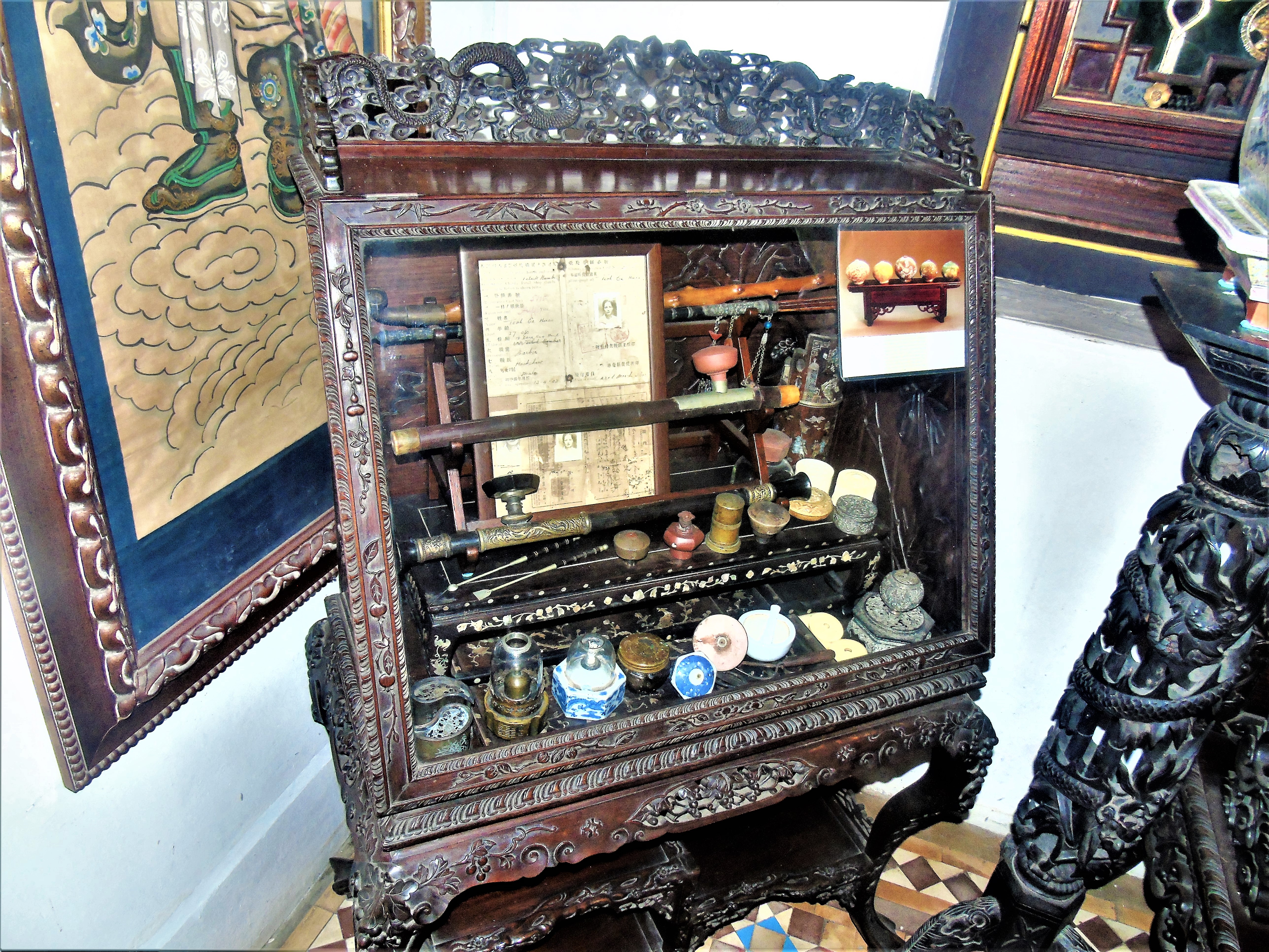 Οι φωτογραφίες και τα κάδρα είναι διαφωτιστικές και για την ιστορία των Περανακάν, οι οποίοι ήλθαν τον 16ο αιώνα ως μετανάστες και έκαναν οικογένειες με ντόπιες γυναίκες του Πενάνγκ, αλλά και για την πολιτιστική επίδραση των Κινέζων στην περιοχή. Και βέβαια, δεν θα μπορούσαν να απουσιάζουν φωτογραφίες του Τσουνγκ, ο οποίος τιμάται και με άγαλμα σε φυσικό μέγεθος, έργο του Βρετανού γλύπτη Μπένζαμιν Κρέσγουικ στον βωμό του ναού ενώπιον του οποίου συνεδρίαζε η Τριάδα. Ομολογώ πως μου φαίνεται κάπως παράταιρο να διεξάγονται συζητήσεις για τζόγο, εμπόριο οπίου ή πορνεία μπροστά σε έναν ναό, όπου πάντως δύο φορές ετησίως έρχονται απόγονοι του Τσουνγκ να τιμήσουν τη μνήμη του.