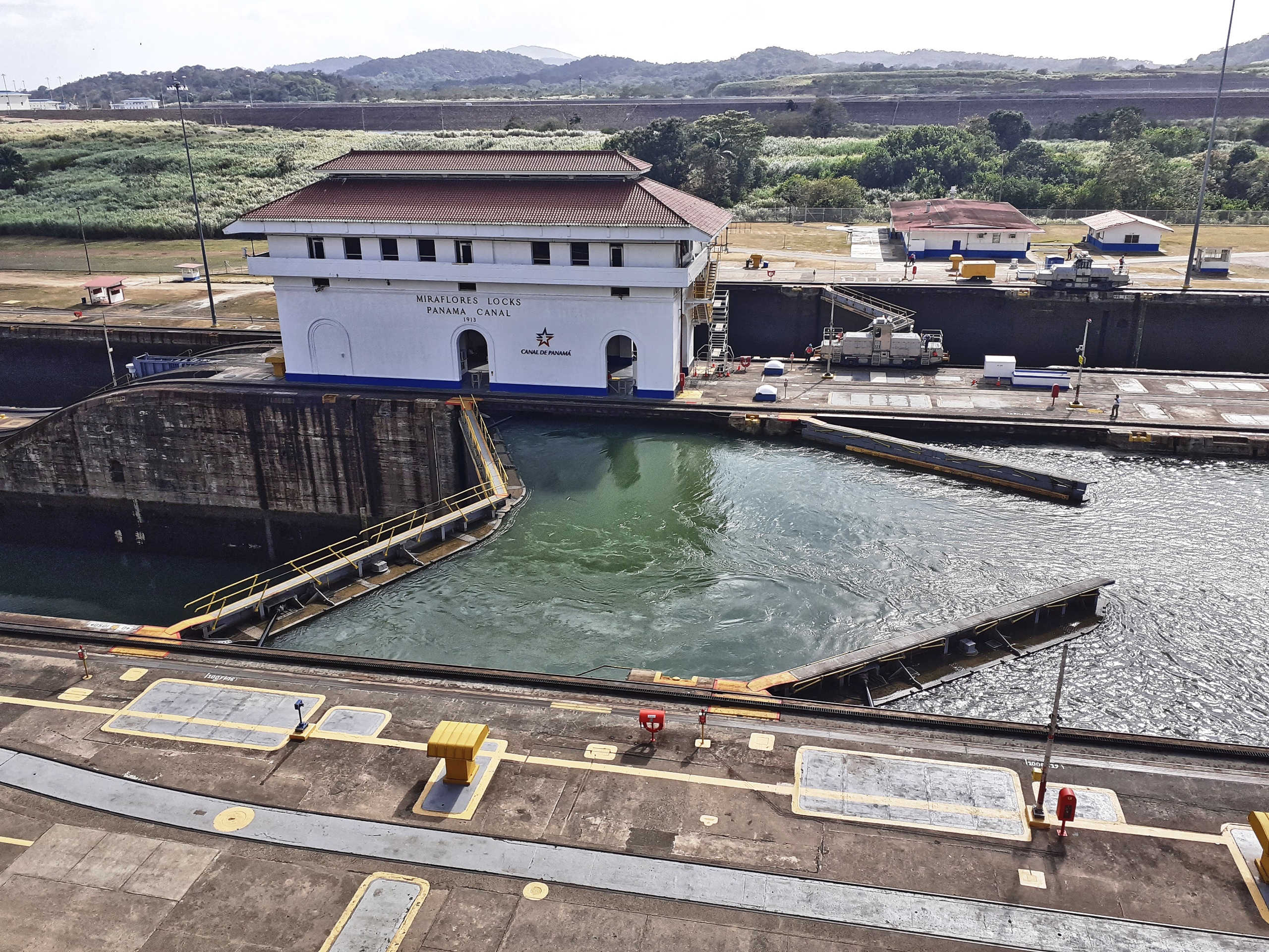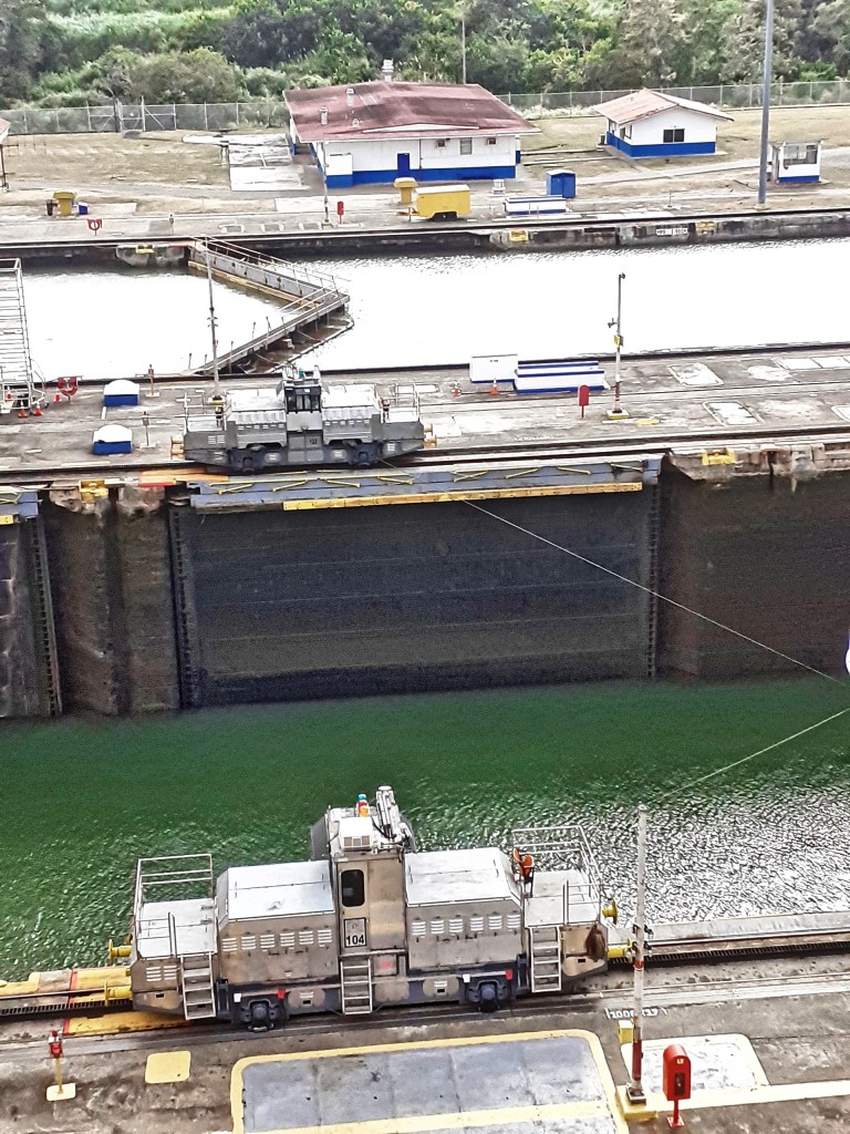 Από την ταράτσα του Μιραφλόρες παρακολουθώ την «κατάβαση» του γιοτ και κάποιων επόμενων πλοίων, μεταξύ των οποίων και ένα που μεταφέρει 5.000 αυτοκίνητα. Η «κατάβαση» είναι δυνατή χάρη στην υποχώρηση με αντλίες των νερών της δεξαμενής, στην τεχνητή λίμνη της οποίας τα νερά αδειάζουν, αλλά και δύο βαρέα οχήματα, σαν τεθωρακισμένα, που ρυμουλκούν το πλοίο από τα πλάγια. Αυτά ονομάζονται «μουλάρια», ανάμνηση της εποχής που τα πλοία τα ρυμουλκούσαν ημίονοι.