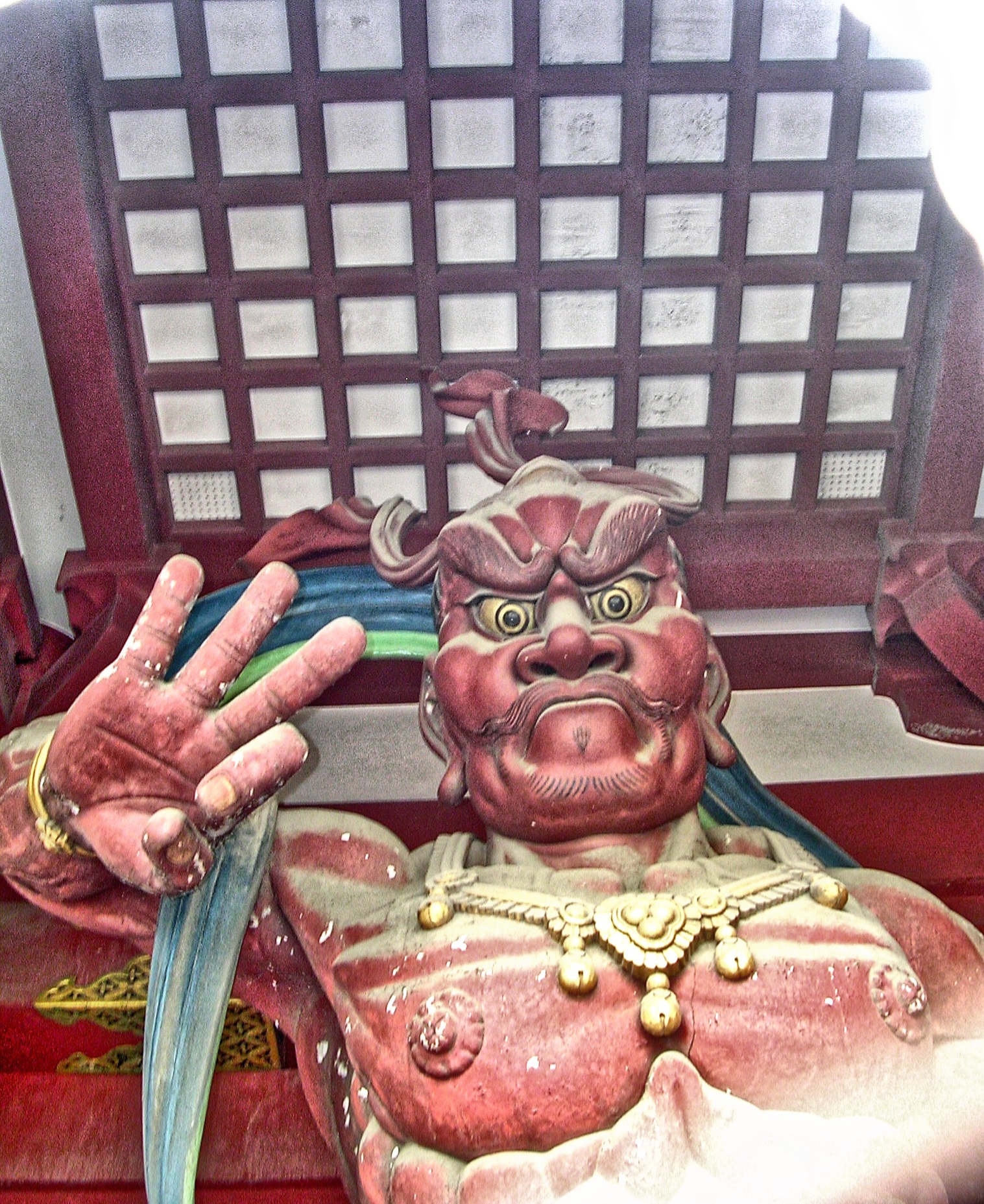 Στα δεξιά του διαδρόμου δεσπόζει η Αίθουσα Μπεντέντο, όπου φυλάσσεται η εικόνα της θεάς του Πλούτου και της Ευμάρειας Μπέντεν. Προχωρώντας μερικά μέτρα, φθάνω στη διώροφη -από οπλισμένο σκυρόδεμα, με κόκκινους κίονες και πράσινες οροφές- πύλη του 1964 Χοζομόν. Στα αριστερά της ορθώνεται μια πενταώροφη παγόδα πάνω σε διώροφο κτήριο.