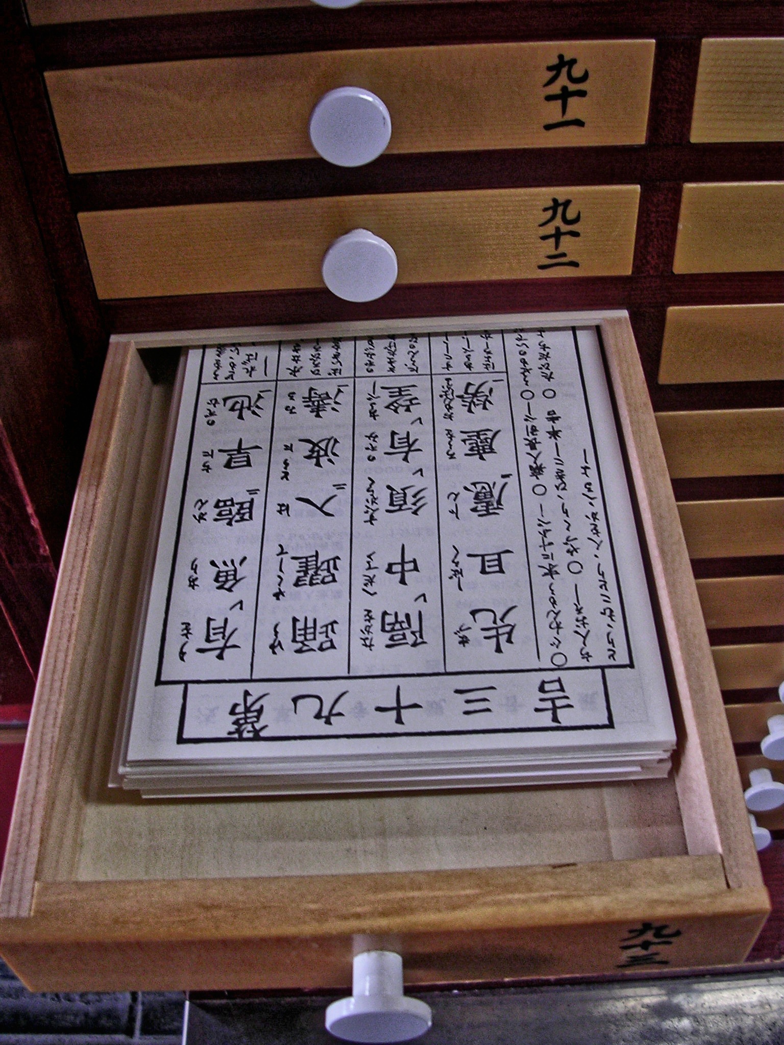 Μπροστά στον κυρίως ναό υπάρχει ένα κιόσκι. Βάζω ένα κέρμα των 100 γιεν στην υποδοχή του παγκαριού. Παίρνω στα χέρια μου ένα κυλινδρικό κουτί το οποίο περιέχει μικρές ράβδους. Το ανακινώ και αφήνω να βγει μία από αυτές. Αυτή έχει έναν αριθμό σε ιαπωνικά ιδεογράμματα. Ψάχνω να βρω στο κιόσκι το ξύλινο συρτάρι με τα αντίστοιχα ιδεογράμματα. Το ανοίγω και βγάζω το πρώτο ρυζόχαρτο που βρίσκω. Με τη βοήθεια μιας Ιαπωνίδας το μεταφράζω. Η «μεταφράστρια» δείχνει να μην μπορεί να πιστέψει αυτό που διαβάζει. «Ήρθες από κάποιο μακρινό μέρος» γράφει ανάμεσα στα άλλα.