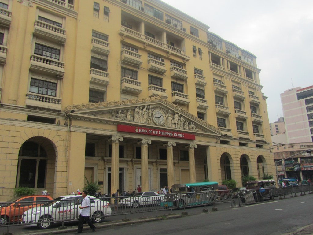 Απέναντι βλέπω το επιβλητικό κτήριο Ρόμαν Σάντος της BPI, Τράπεζας των Φιλιππίνων Νήσων με τη νεοκλασική πρόσοψη, τους 4 ιωνικούς κίονες, το ελληνόμορφο τριγωνικό αέτωμα και την ζωφόρο γωνία Εσκόλτα και Πλατείας Λάκσον. Ο δρόμος πήρε το όνομά του το 1594 από τον «Εσκολτάρ», αξιωματικό συνοδό των φρουρών έξω από τα τείχη της παλαιάς πόλης.