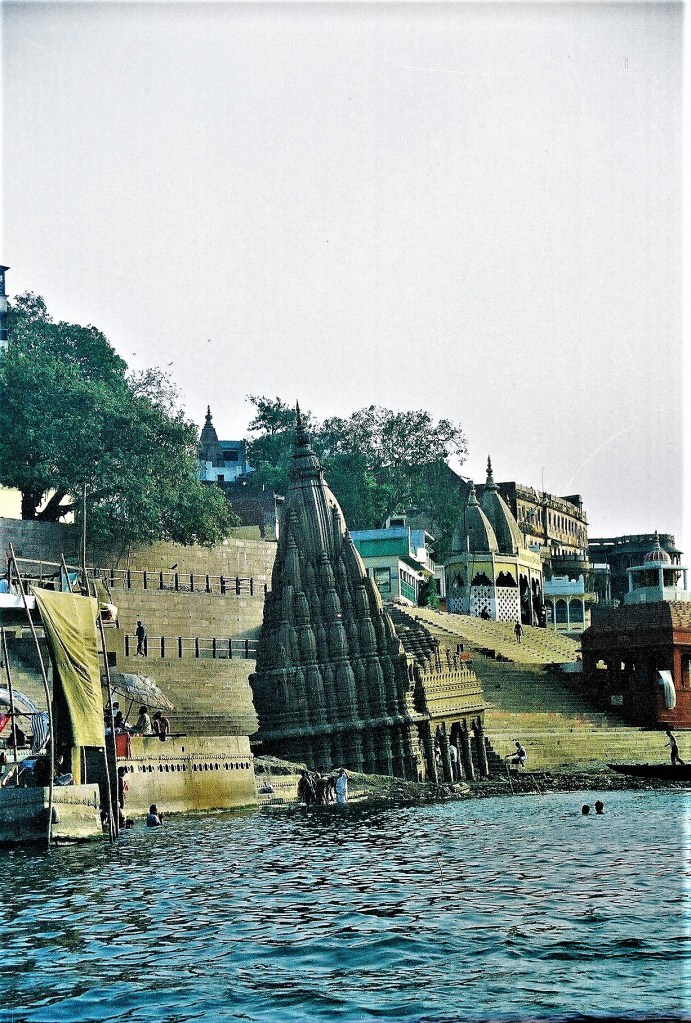 Παρασκευή 25 Απριλίου 1998. Αξημέρωτα ξεκινώ περιήγηση στα 88 γκατ του Βαρανάσι όπως ονομάζεται επισήμως το Κάσι. Επί αποικιοκρατίας ονομαζόταν Μπενάρες. Νοικιάζω βάρκα και διαπλέω τον Γάγγη από Νότο προς Βορρά. Περνώντας μπροστά από τα περισσότερα γκατ, διακρίνω στο βάθος αριστερά έναν κεκλιμένο πύργο ύψους 12 μέτρων. Γέρνει προς τα πίσω, βορειοδυτικά. Τον αναγνωρίζω αμέσως, καθώς είναι το πολυφωτογραφημένο μαντίρ -ναός- Ρατνεσβάρ Μαχαντέβ ή Ματρί-ριν, «Κεκλιμένος Ναός» στην εντελώς απόκοσμη Μανικαρνίκα. Η κλίση του ειναι 9°, μεγαλύτερη των 4° του Πύργου της Πίζας