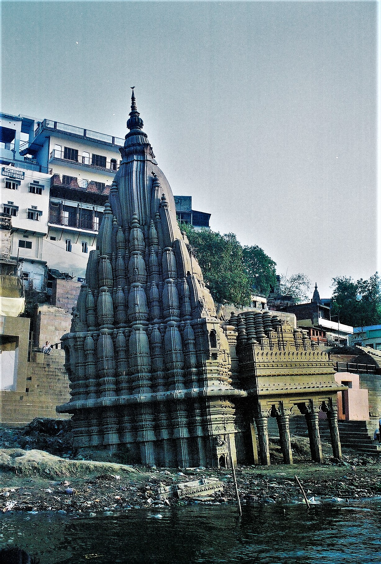 Παρασκευή 25 Απριλίου 1998. Αξημέρωτα ξεκινώ περιήγηση στα 88 γκατ του Βαρανάσι όπως ονομάζεται επισήμως το Κάσι. Επί αποικιοκρατίας ονομαζόταν Μπενάρες. Νοικιάζω βάρκα και διαπλέω τον Γάγγη από Νότο προς Βορρά. Περνώντας μπροστά από τα περισσότερα γκατ, διακρίνω στο βάθος αριστερά έναν κεκλιμένο πύργο ύψους 12 μέτρων. Γέρνει προς τα πίσω, βορειοδυτικά. Τον αναγνωρίζω αμέσως, καθώς είναι το πολυφωτογραφημένο μαντίρ -ναός- Ρατνεσβάρ Μαχαντέβ ή Ματρί-ριν, «Κεκλιμένος Ναός» στην εντελώς απόκοσμη Μανικαρνίκα. Η κλίση του ειναι 9°, μεγαλύτερη των 4° του Πύργου της Πίζας