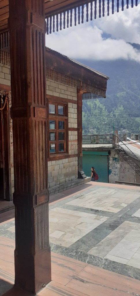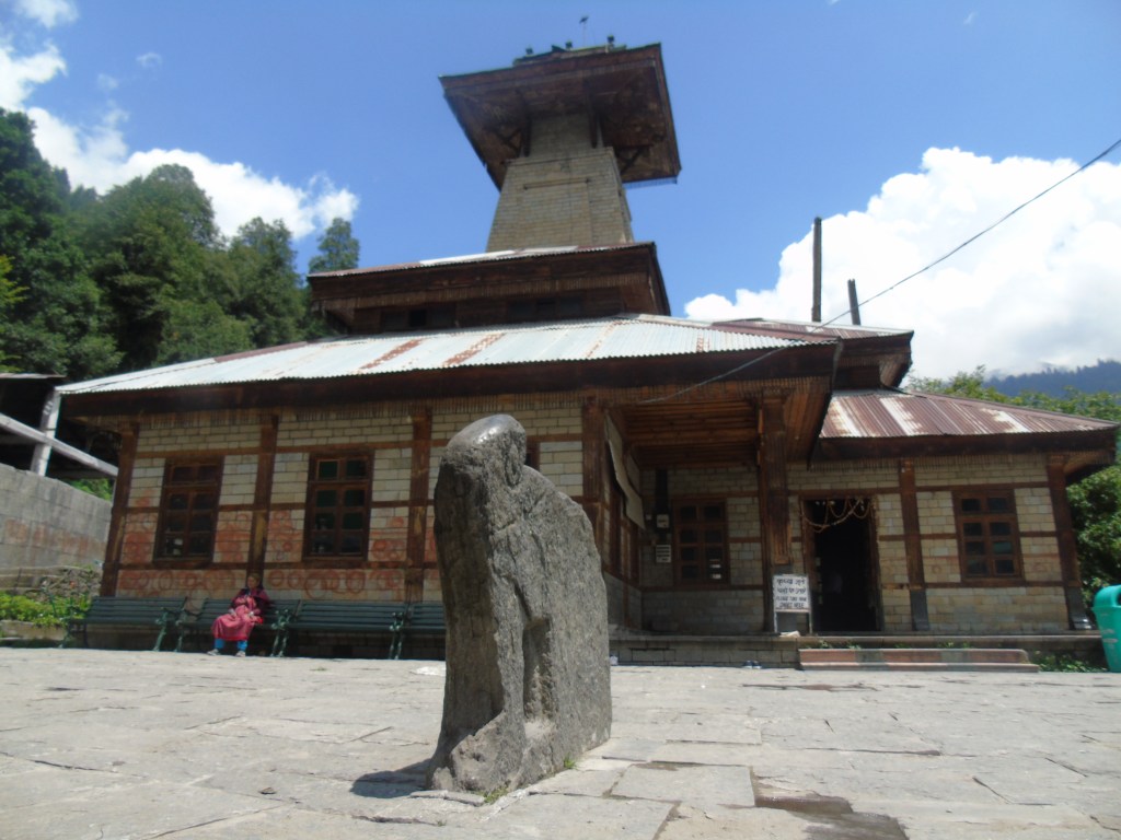 Μετά το περπάτημα στις ανηφοριές του Μανάλι, η αναζωογονητική για μέσα Ιουλίου δροσιά που επικρατεί στο προαύλιο του ναού είναι κάτι παραπάνω από καλοδεχούμενη και εν μη το άλλο μου επιτρέπει να βιώσω ευχάριστα το μυστηριακό κλίμα του ναού και να θαυμάσω την αρχιτεκτονική του. Τα κυρίαρχα υλικά είναι ξύλο και πέτρα. Το στυλ του θυμίζει παγόδα. Η σικάρα του, αυτός ο χαρακτηριστικός πυργίσκος που στους ναούς του ινδικού βορρά ορθώνεται σαν περίγραμμα βουνοκορφής πάνω από την γκαρμπαγκρίχα, το άδυτο όπου φιλοξενείται η θεότητα στην οποία είναι αφιερωμένος ο ναός, έχει ένα περίεργο σχήμα. Μοιάζει με κόλουρη πυραμίδα με μια τετράγωνη οροφή σαν πλατφόρμα στην κορυφή της αλλά θυμίζει κάπως και υψικάμινο εργοστασίου.