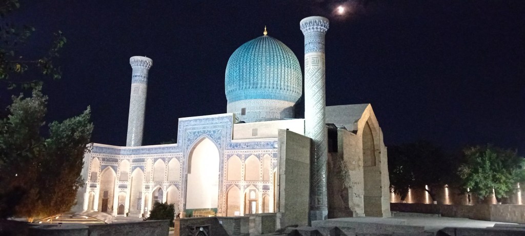 Έχει πια βραδιάσει καθώς παίρνω τον δρόμο για το ξενοδοχείο, ρίχνοντας μια τελευταία ματιά στο μαυσωλείο που είναι το κυριότερο από τα ουκ ολίγα σημαντικά αξιοθέατα της πόλεως. Πάμε για την πανσέληνο του Οκτωβρίου. Το «φεγγάρι του κυνηγού» όπως ονομάζεται, καθώς συμβαίνει στην εποχή που οι κυνηγοί ετοιμάζονται για τον χειμώνα και τα ζώα γίνονται ευκολότερα αντιληπτά στο φως του φεγγαριού μετά την συγκομιδή, μεσουρανεί. Αναρωτιέμαι αν η Σαμαρκάνδη θα ήταν ίδια χωρίς το μαυσωλείο, αφού ο Ταμερλάνος ετάφη εδώ από μια συγκυρία εκείνης της εποχής. Ο ίδιος είχε εποπτεύσει την κατασκευή του τάφου του στο Σαχρισάμπζ, την αγαπημένη του “Πράσινη Πόλη” στον Νότο του σημερινού Ουζμπεκιστάν, κάτι που δεν συνέβη ποτέ, καθώς η διάβαση μέσω των ορεινών περασμάτων που οδηγούσαν σε αυτήν μέσα στο καταχείμωνο ήταν αδύνατη.